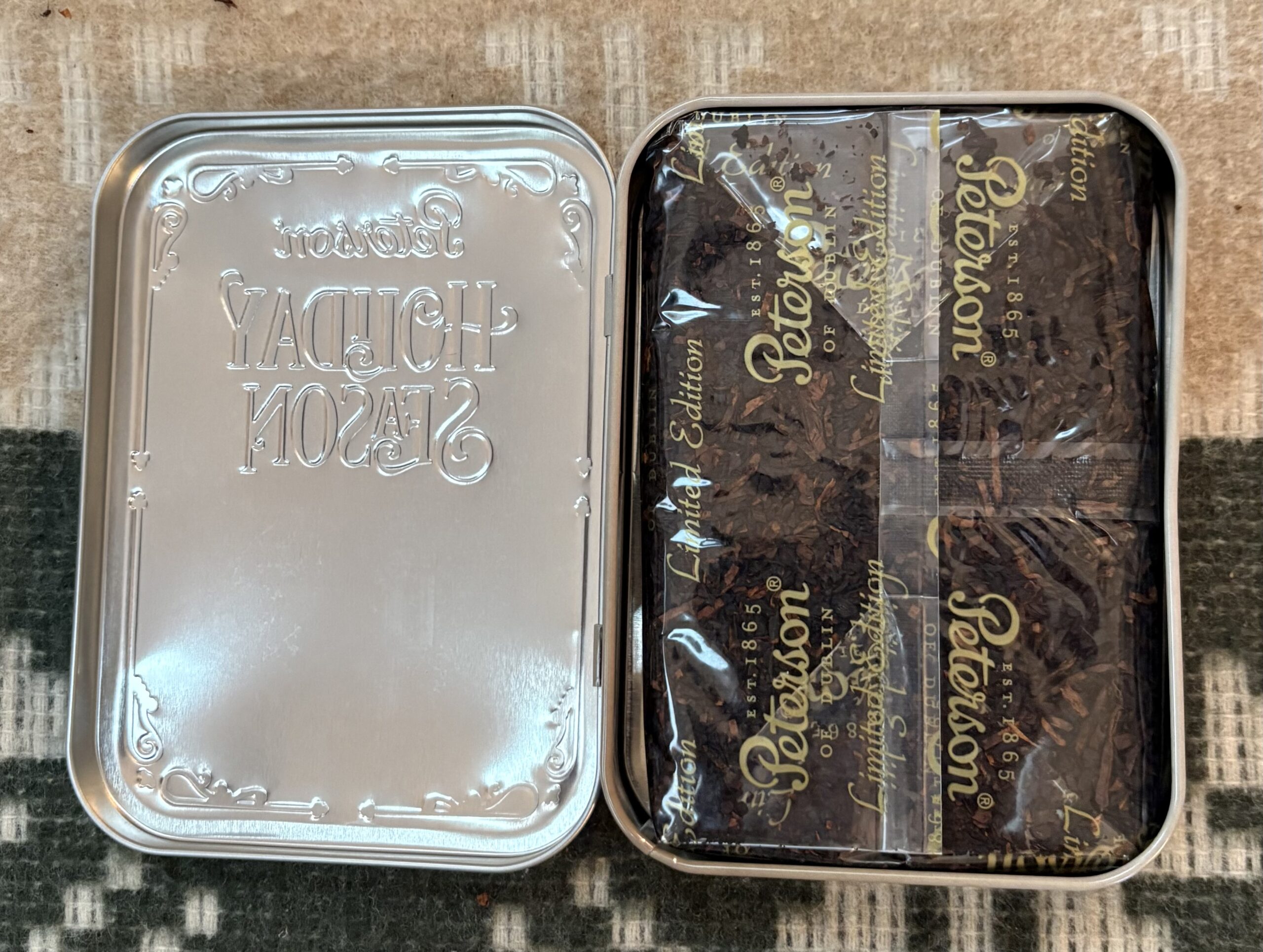 Peterson factory holiday Tin. Out of production. Please see all pictures. Notice the factory foil sticker in the internal bag. This has been stored since 2015. Much of the value is in the collectible festive Christmas tin. 100 grams
