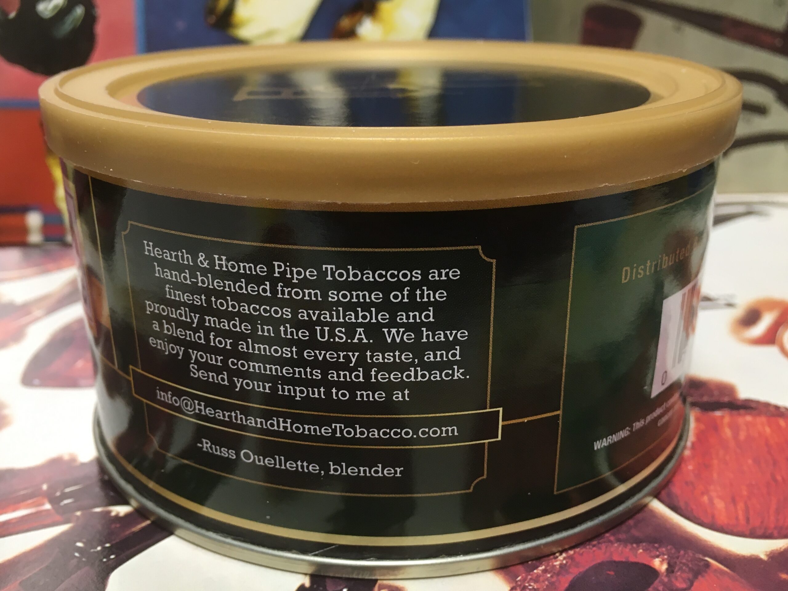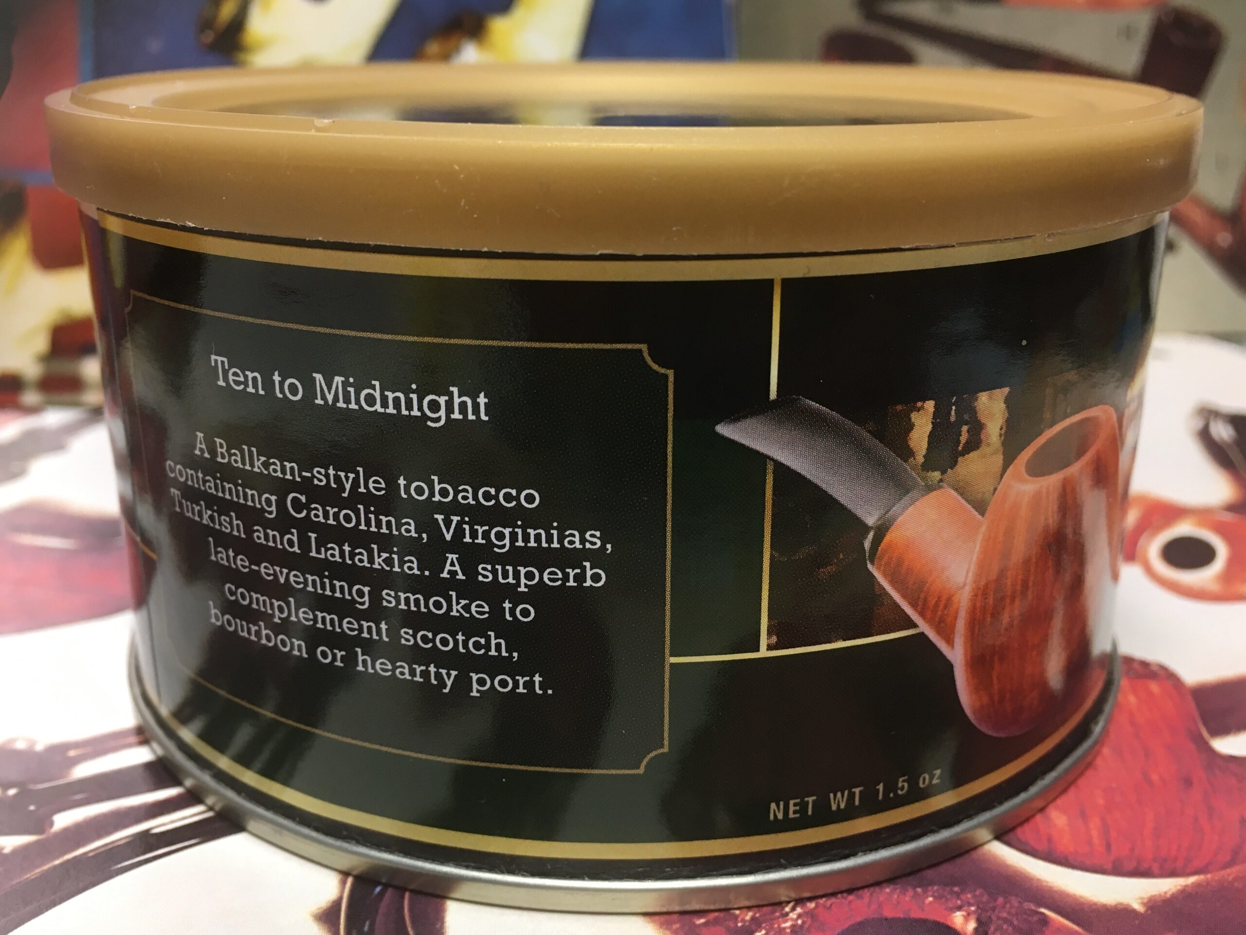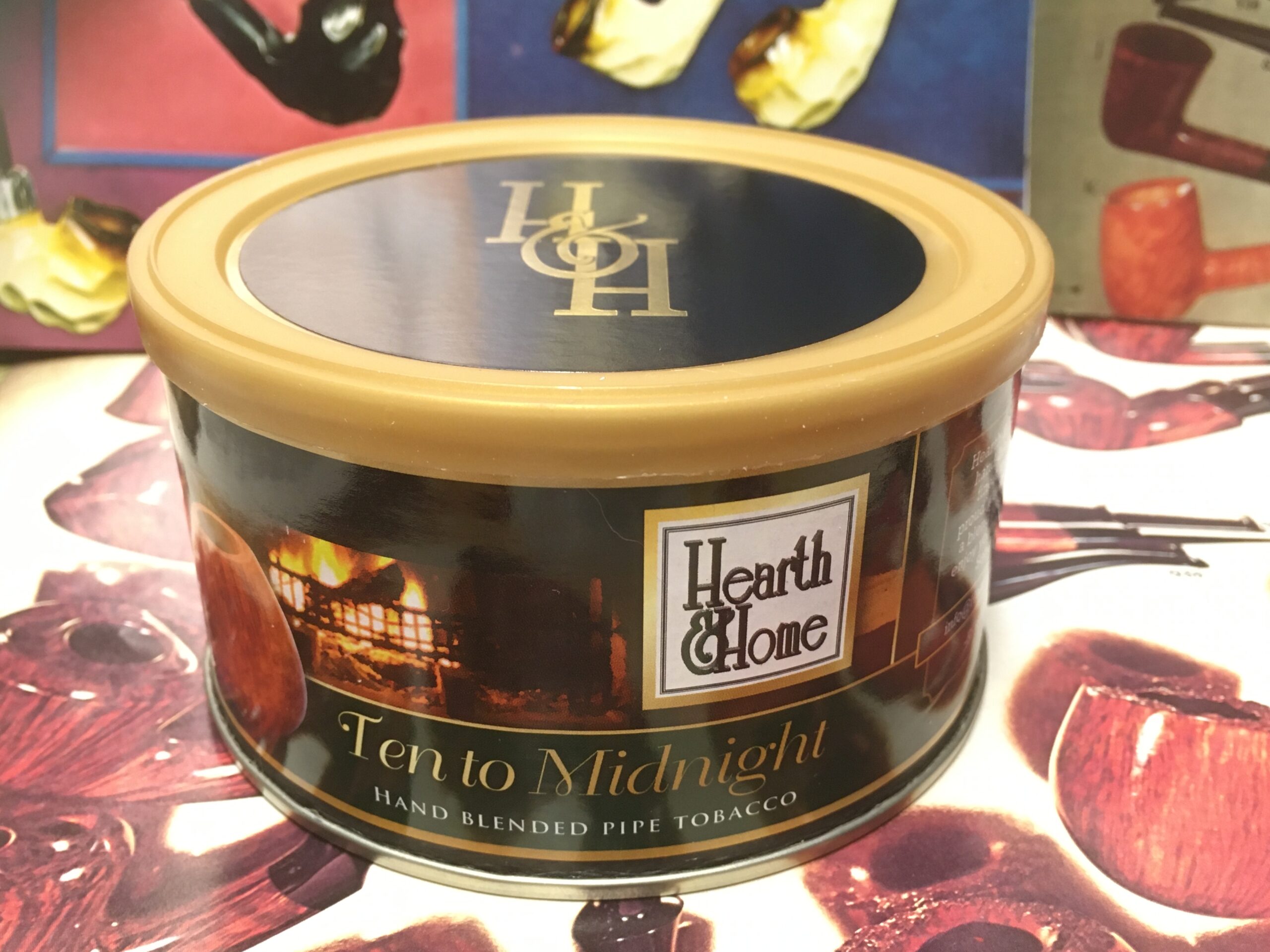 Hearth & Home, Ten to Midnight hand blended pipe tobacco (2014) 1.5oz - Sealed Tin. Blended by Russ Ouellette. "A Balkan-style tobacco containing Carolina, Virginias, Turkish and Latakia. A superb late-evening smoke to compliment scotch, bourbon, or hearty port."
