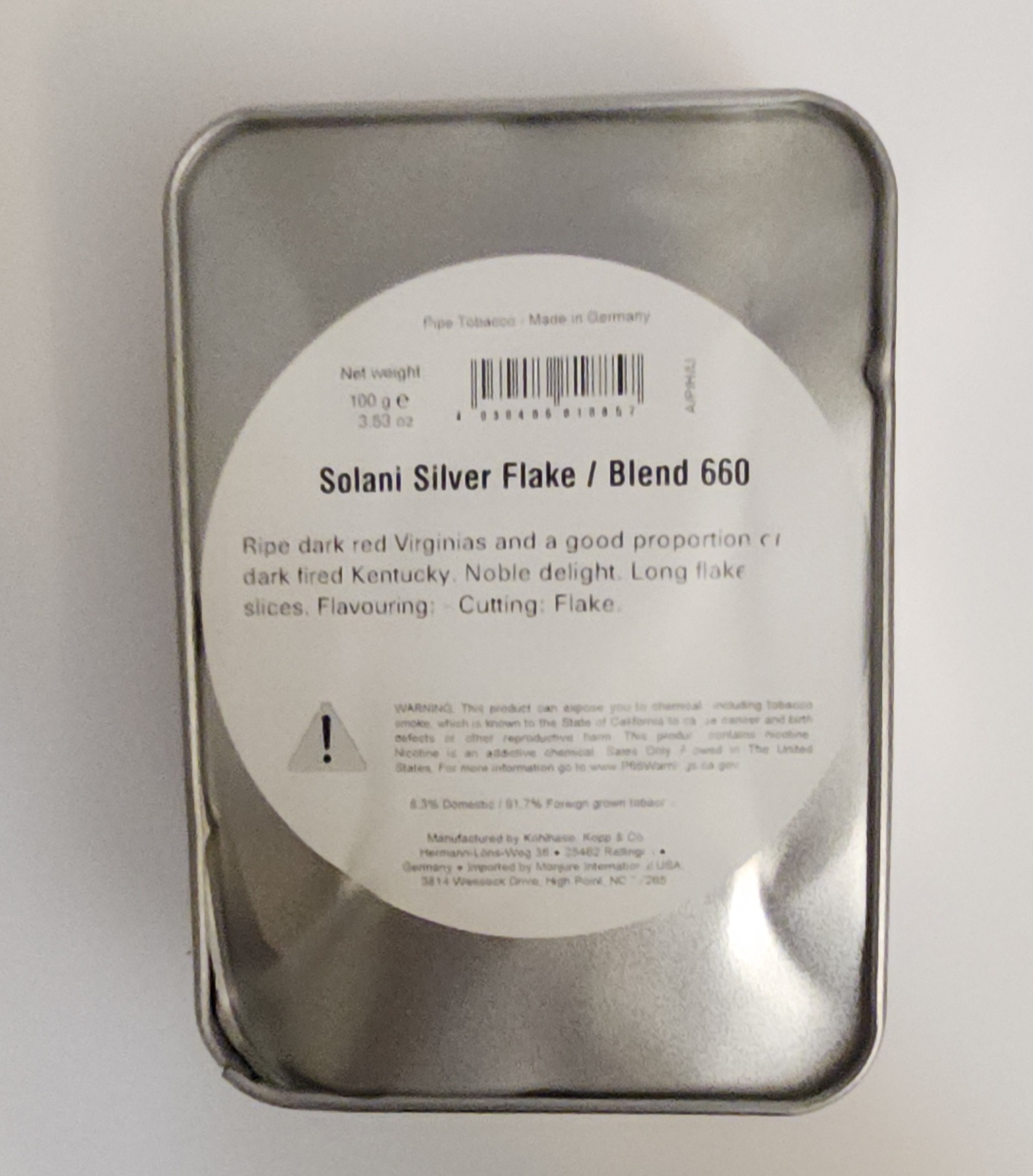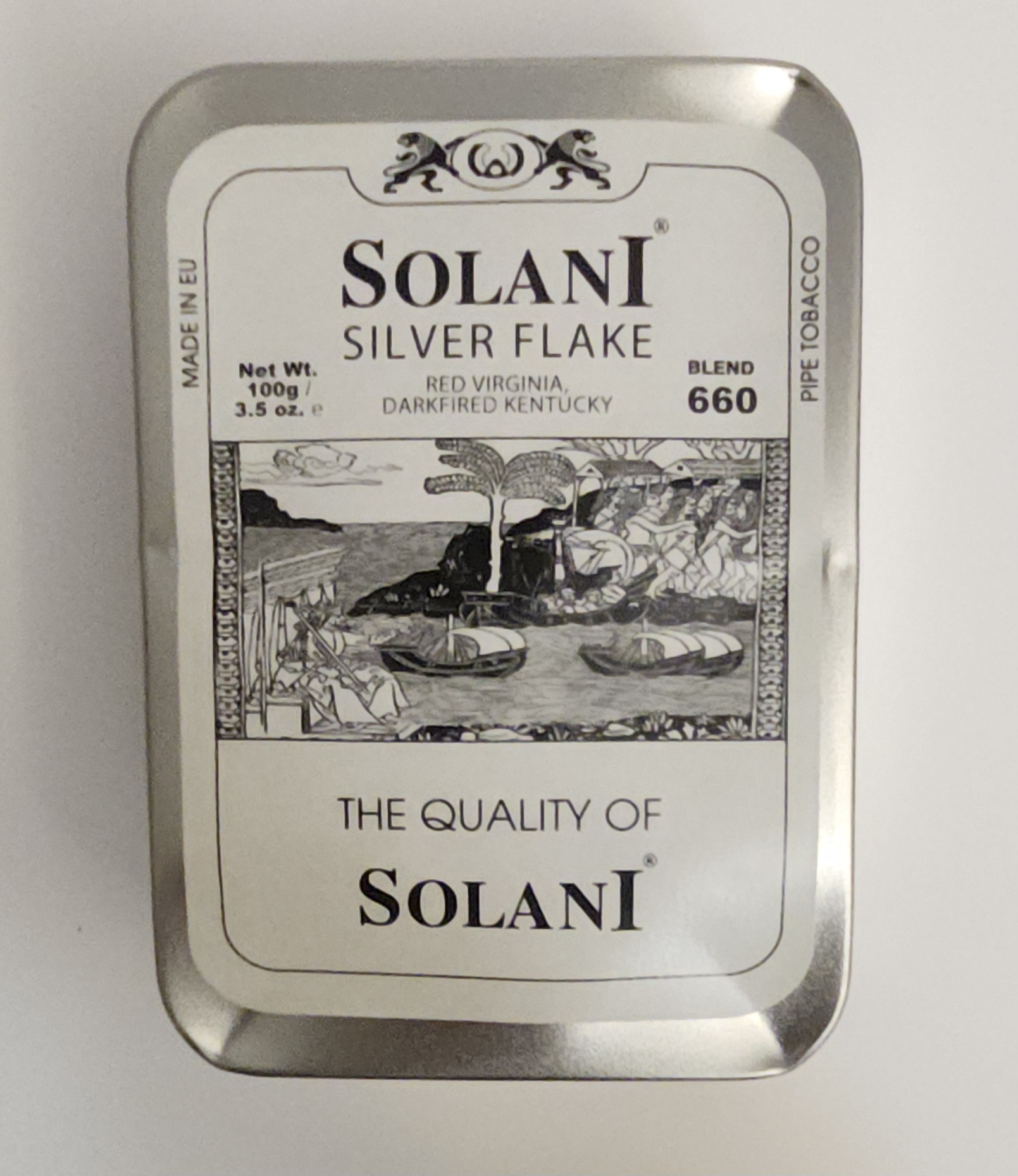 SOLANI SILVER FLAKE. Tin is dented as pictured. The contents are unaffected and remain sealed.