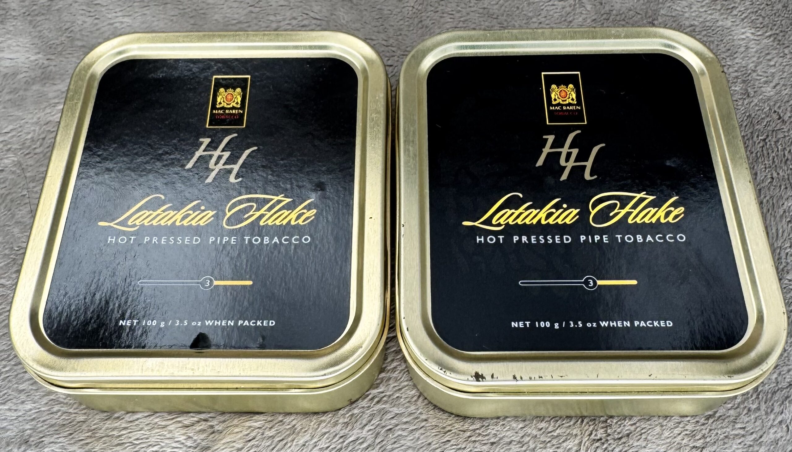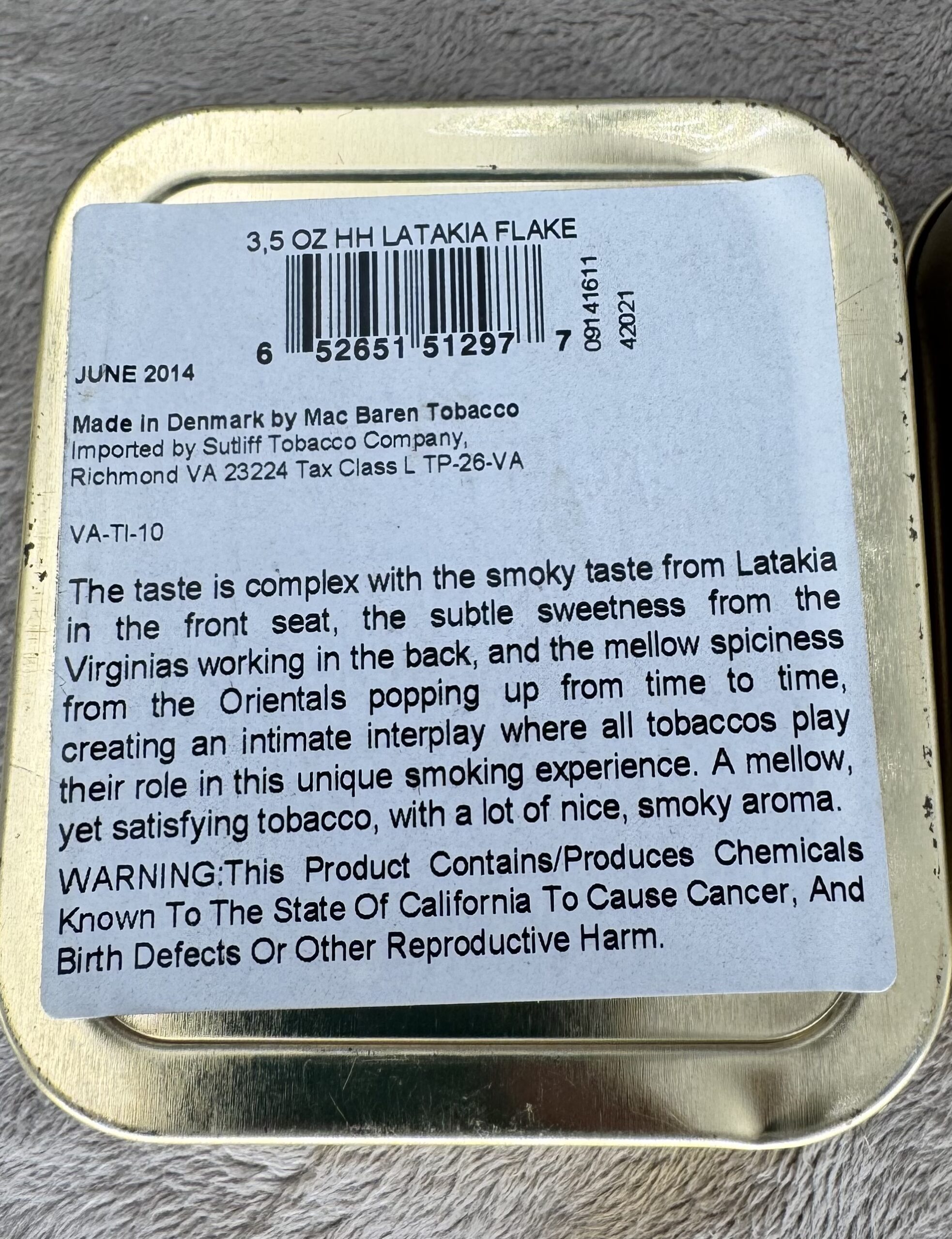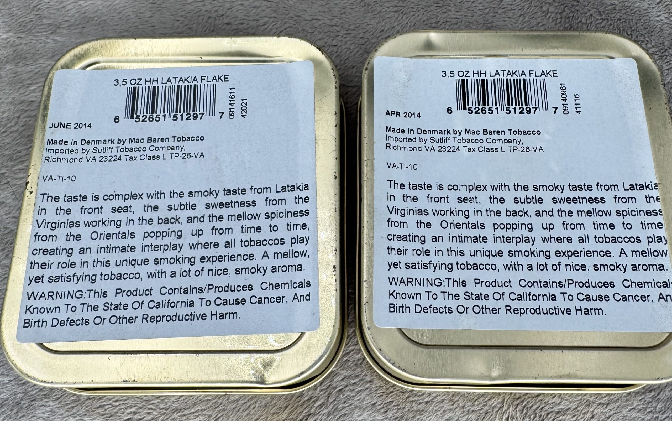 2x Mac Baren HH Latakia Flake sealed both dated 2014.
