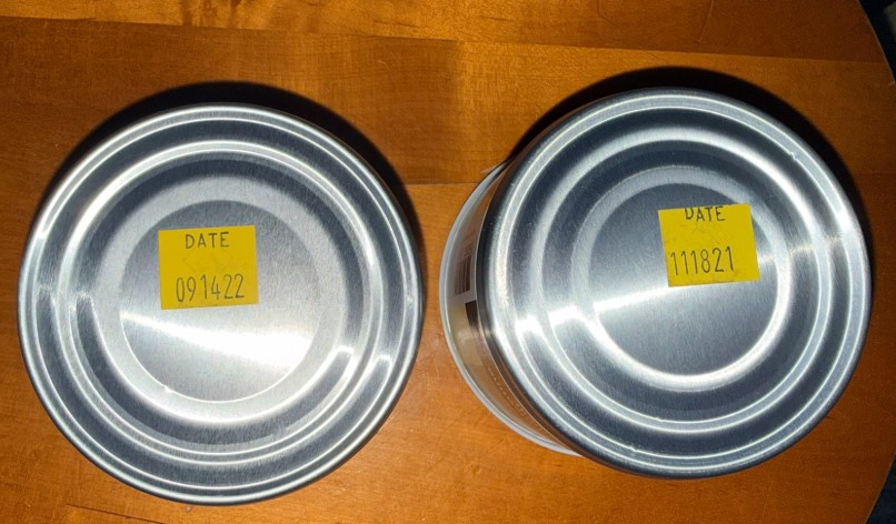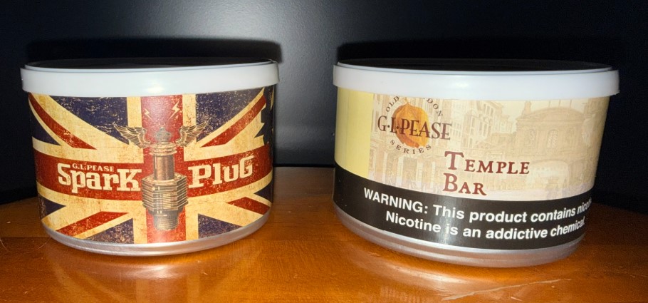 Sealed tins of G. L. Pease Spark Plug(2022) and Temple Bar(2021)