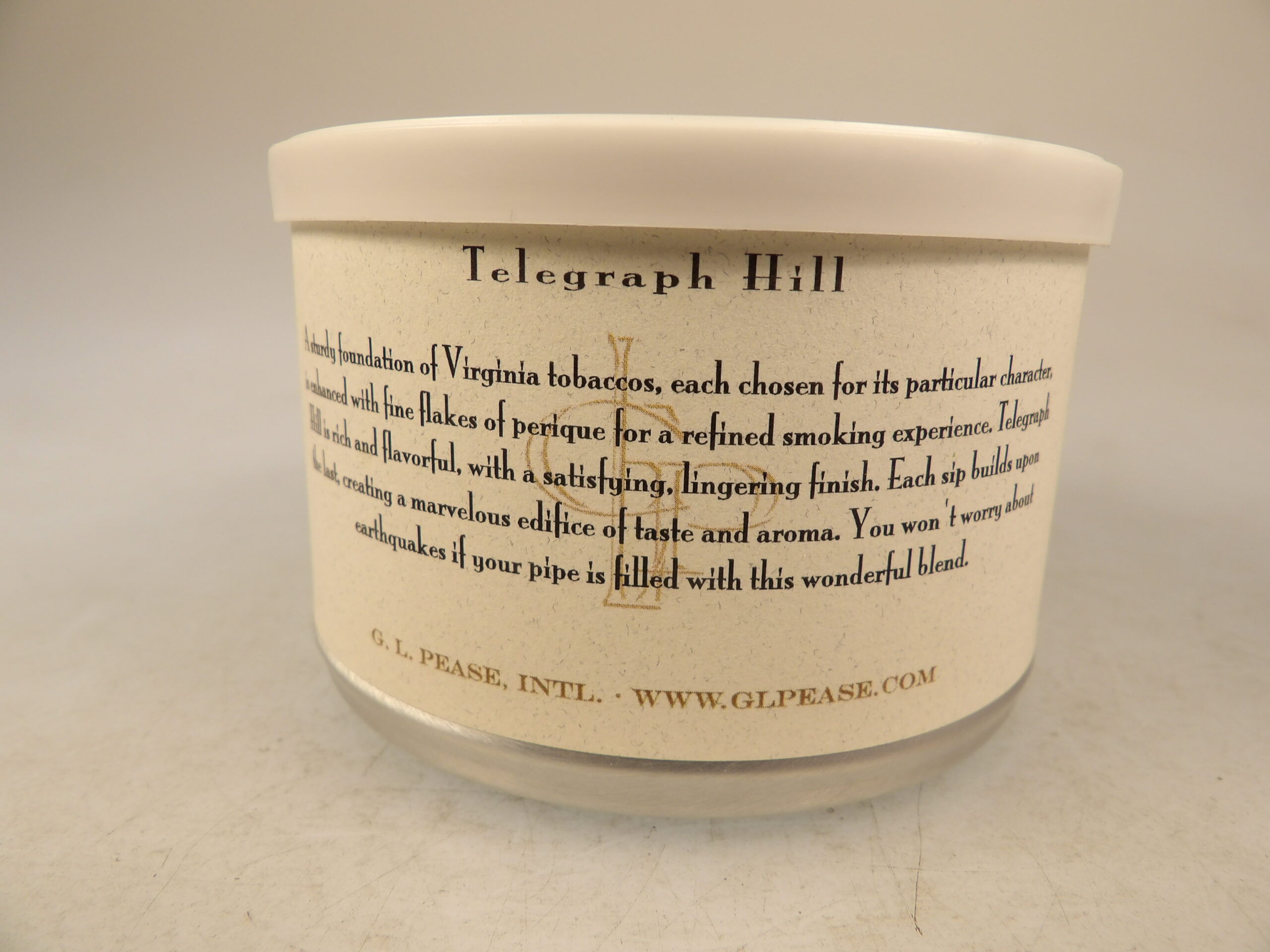DESCRIPTION: Here is an auction for sale. It is a Vintage Collectible G.L. Pease Telegraph Hill 50g Sealed Pipe Tobacco Tin from 2012. This tin is sealed and has never been opened. A sturdy foundation of Virginia tobaccos, each chosen for its unique character, is enhanced with fine flakes of perique for a refined smoking experience. Telegraph Hill is rich and flavorful, with a satisfying, lingering finish. Each sip builds upon the last, creating a marvelous edifice of taste and aroma. You won't worry about earthquakes if your pipe is filled with this wonderful blend. Good Luck Bidding and Thanks for Stopping by.