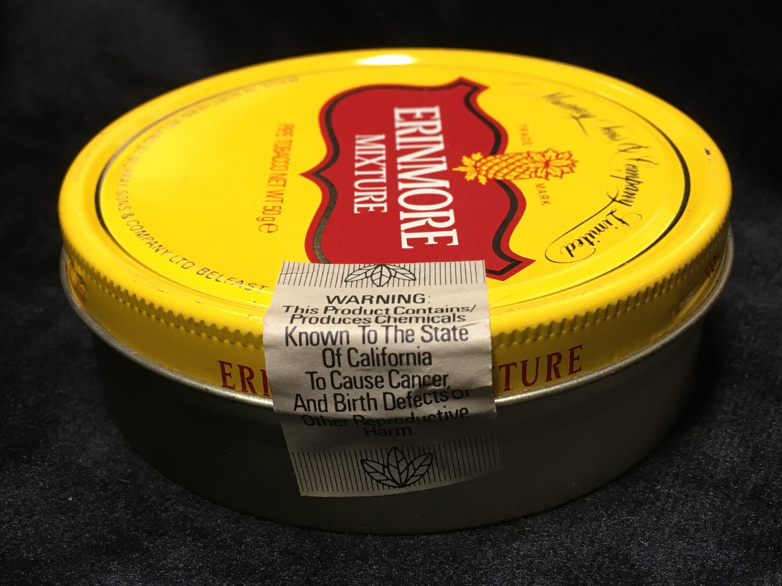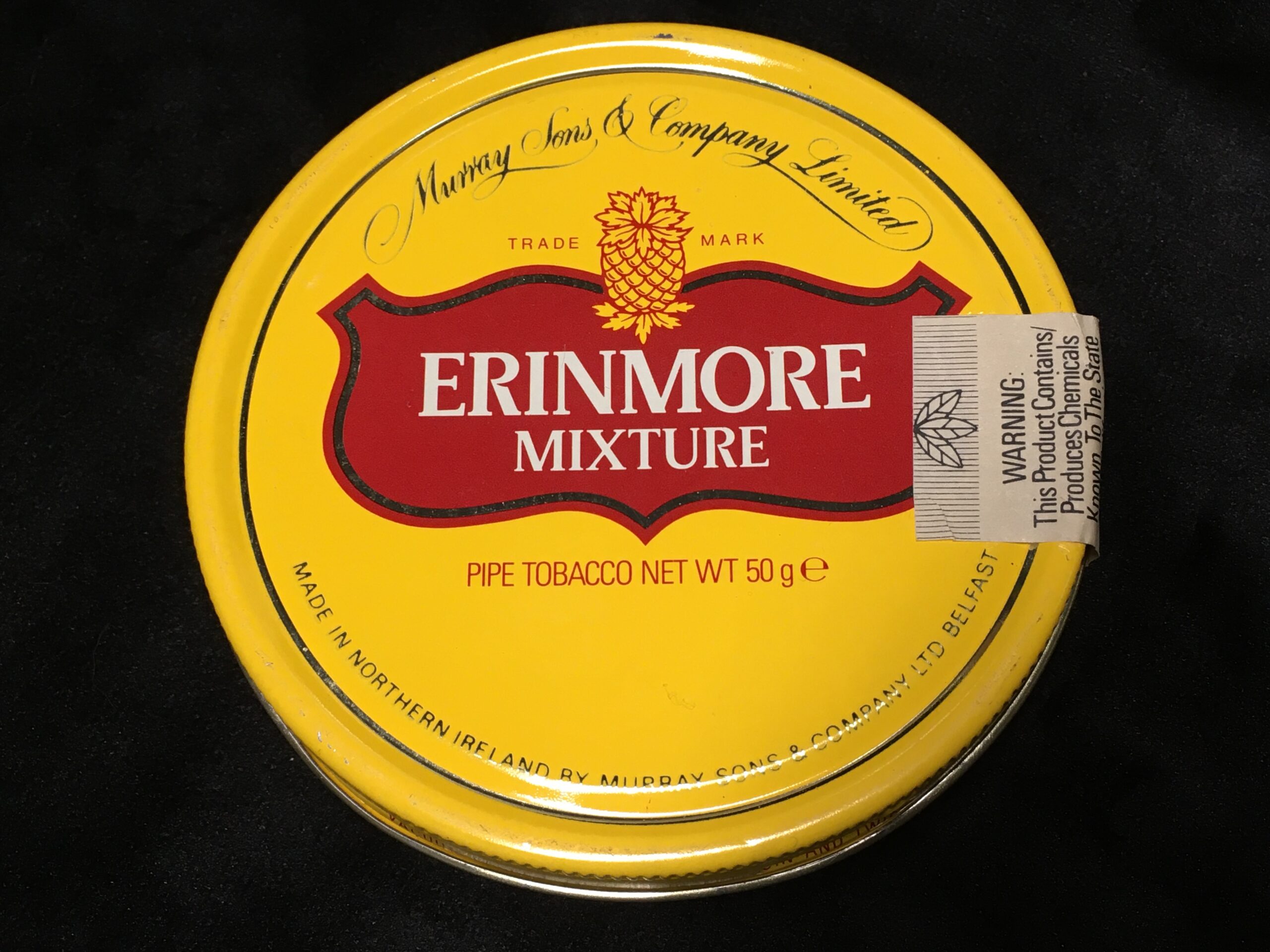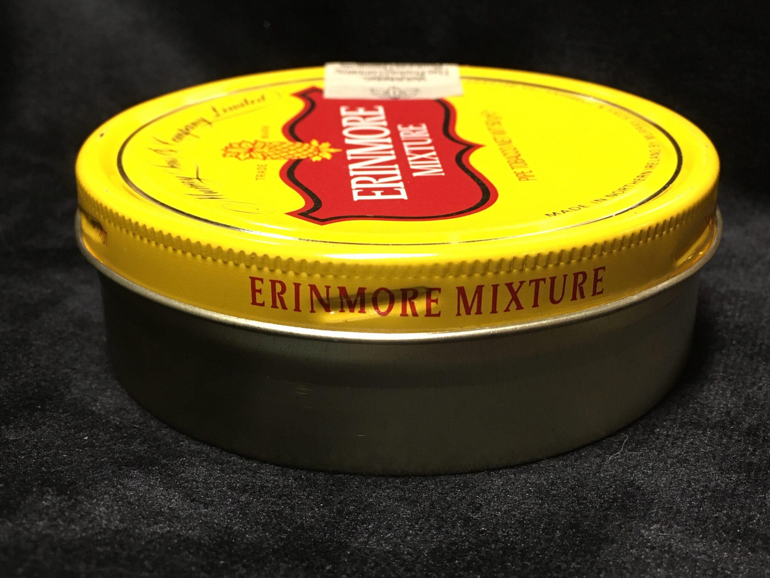 Vintage ERINMORE MIXTURE Pipe Tobacco (1990s?) 50g - Sealed Tin. Made in Northern Ireland by Murray Sons & Company Limited Ltd., Belfast. This has a health warning seal, but no bar code, etc. The round container is light gold, with fully painted lid.