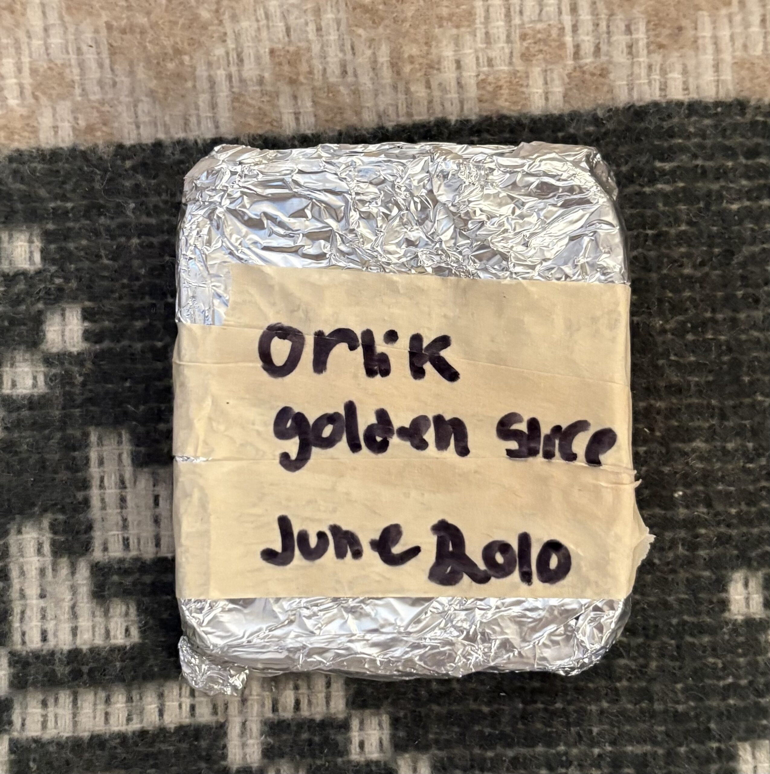 Here is a sealed tin (square style) of Orlik Golden Slices in 50g quantity. For the past 15 years this tobacco tin has been stored wrapped in foil and climate controlled. This ensures light, humidity and temperature are constant. Keeping the aging process safe.