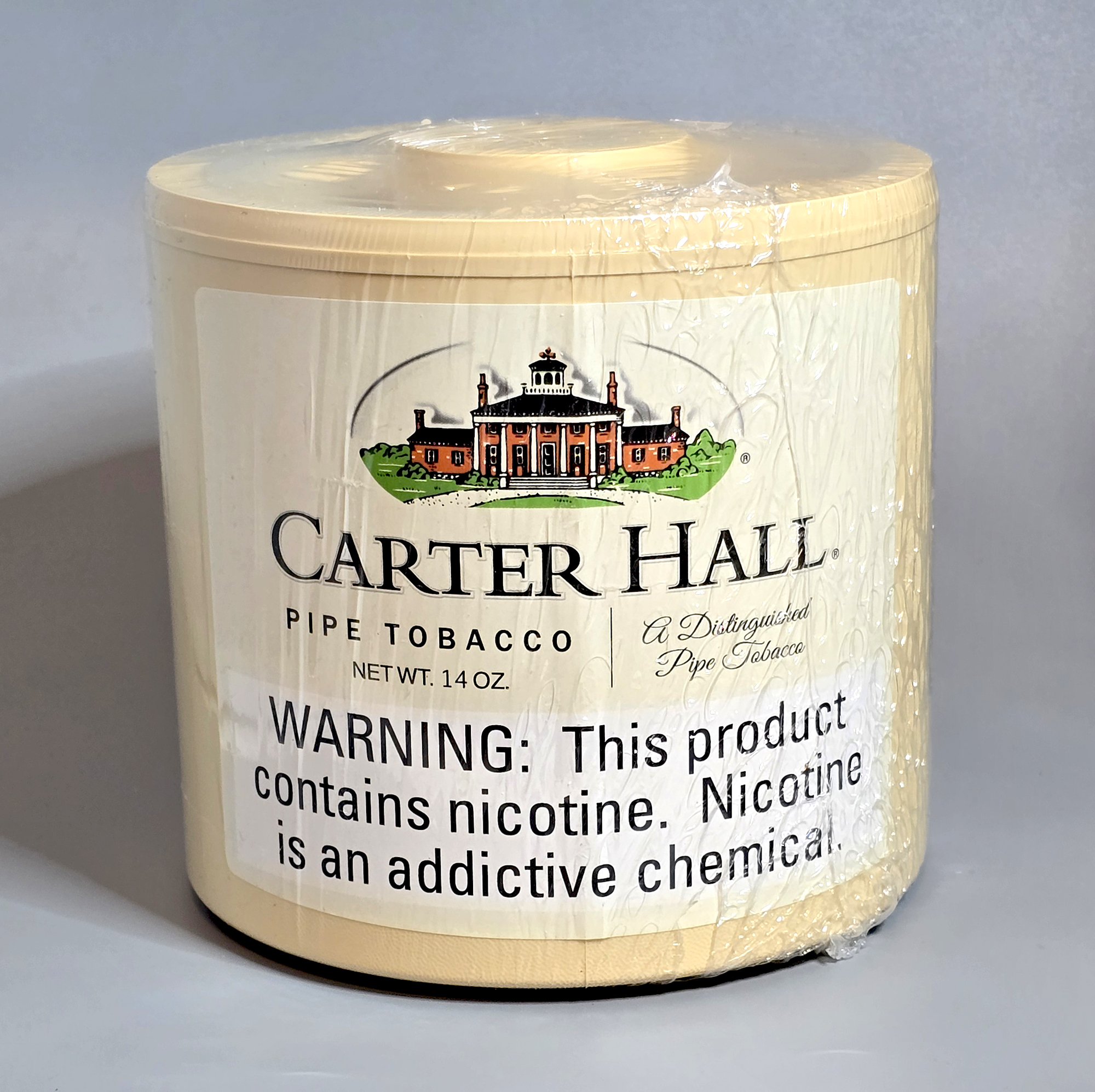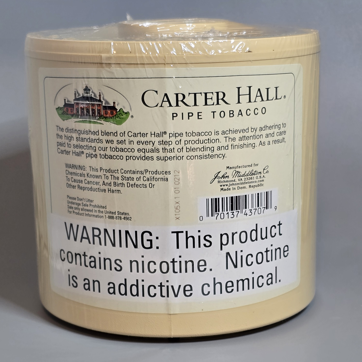 This John Middleton's Carter Hall is a straightforward and enjoyable smoking blend since 1895 by keeping things simple: ribbon-cut Virginia and burley leaf of good quality, combined in the right proportions. This large 14 oz tub is a 2012 production. An old school smoker's favorite was made in the US, that has since moved to a Dominican Rep. production facility. This one is genuine article made in the USA - aged 13 years and still wrapped in cellophane wrap.