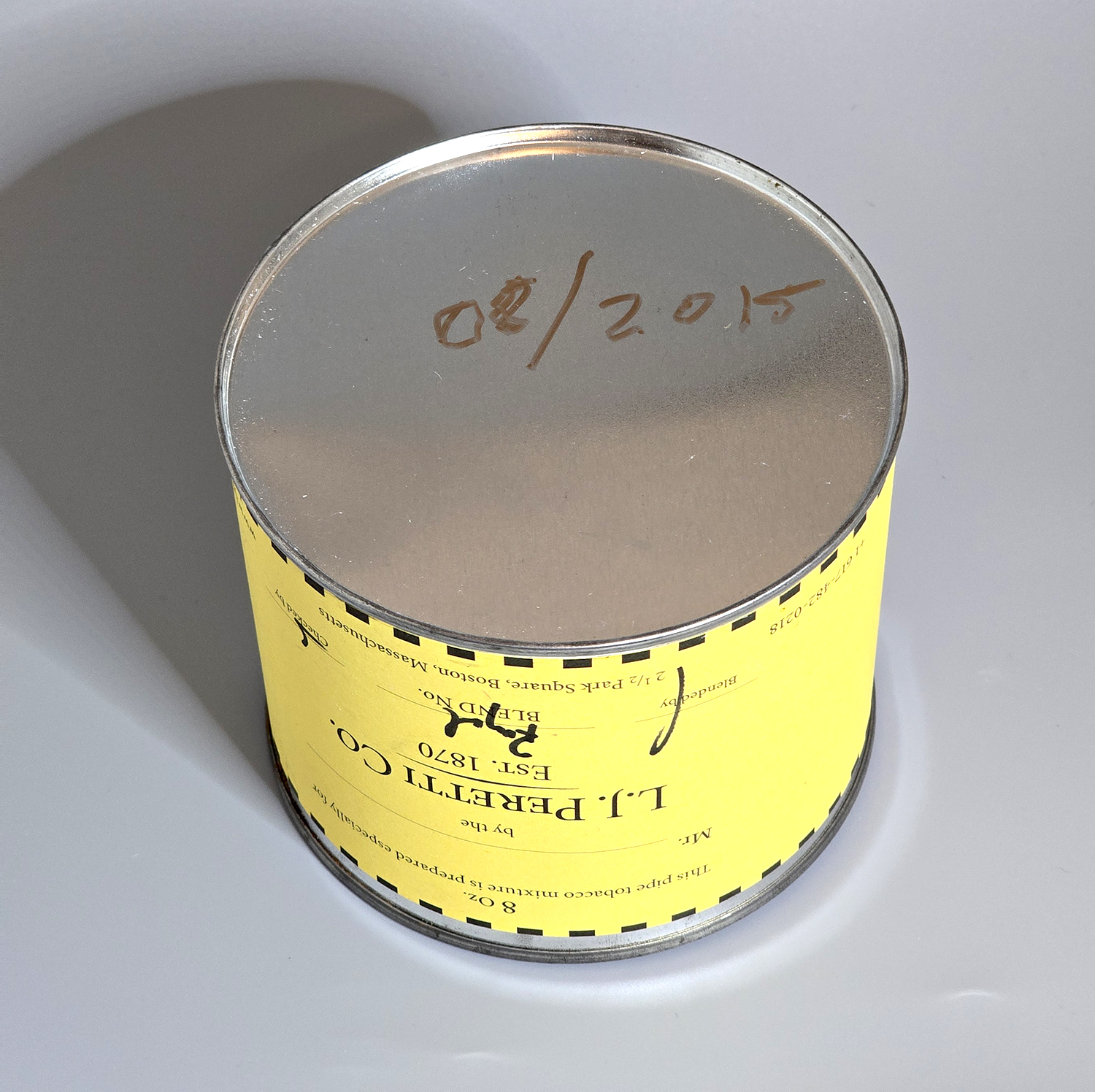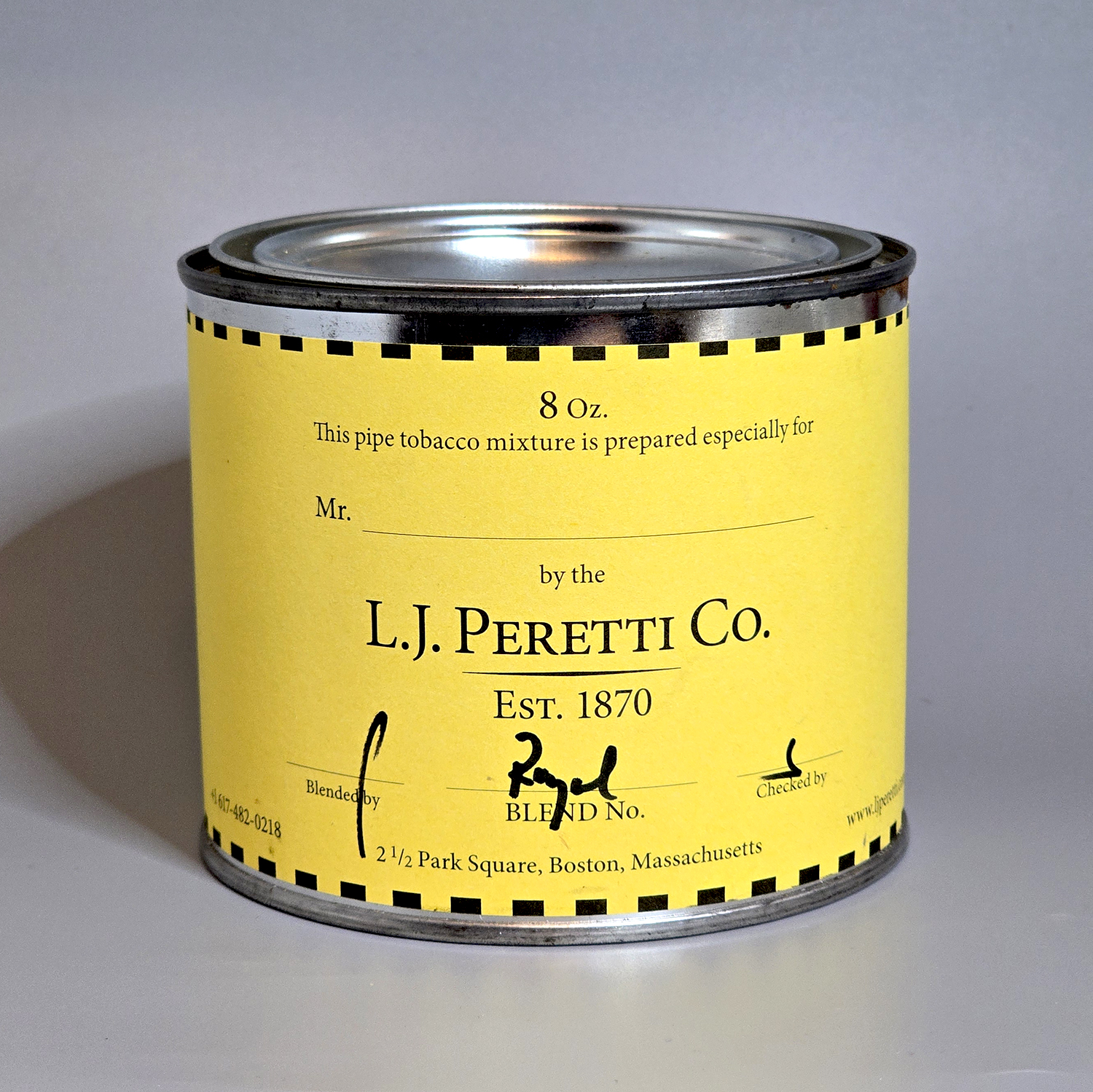 L.J. Peretti's Royal blend is a ribbon-cut blend of the choicest matured Virginian and the finest Oriental tobaccos. It contains a high percentage of the finest Yenidje (Turkish) leaf - Latakia, Oriental/Turkish, Virginia. This 8oz tin has been aged for 10 years!