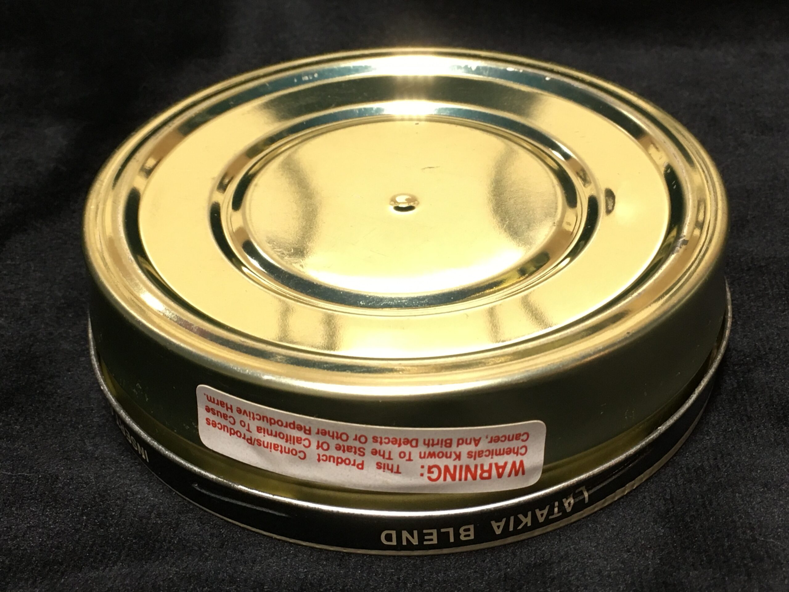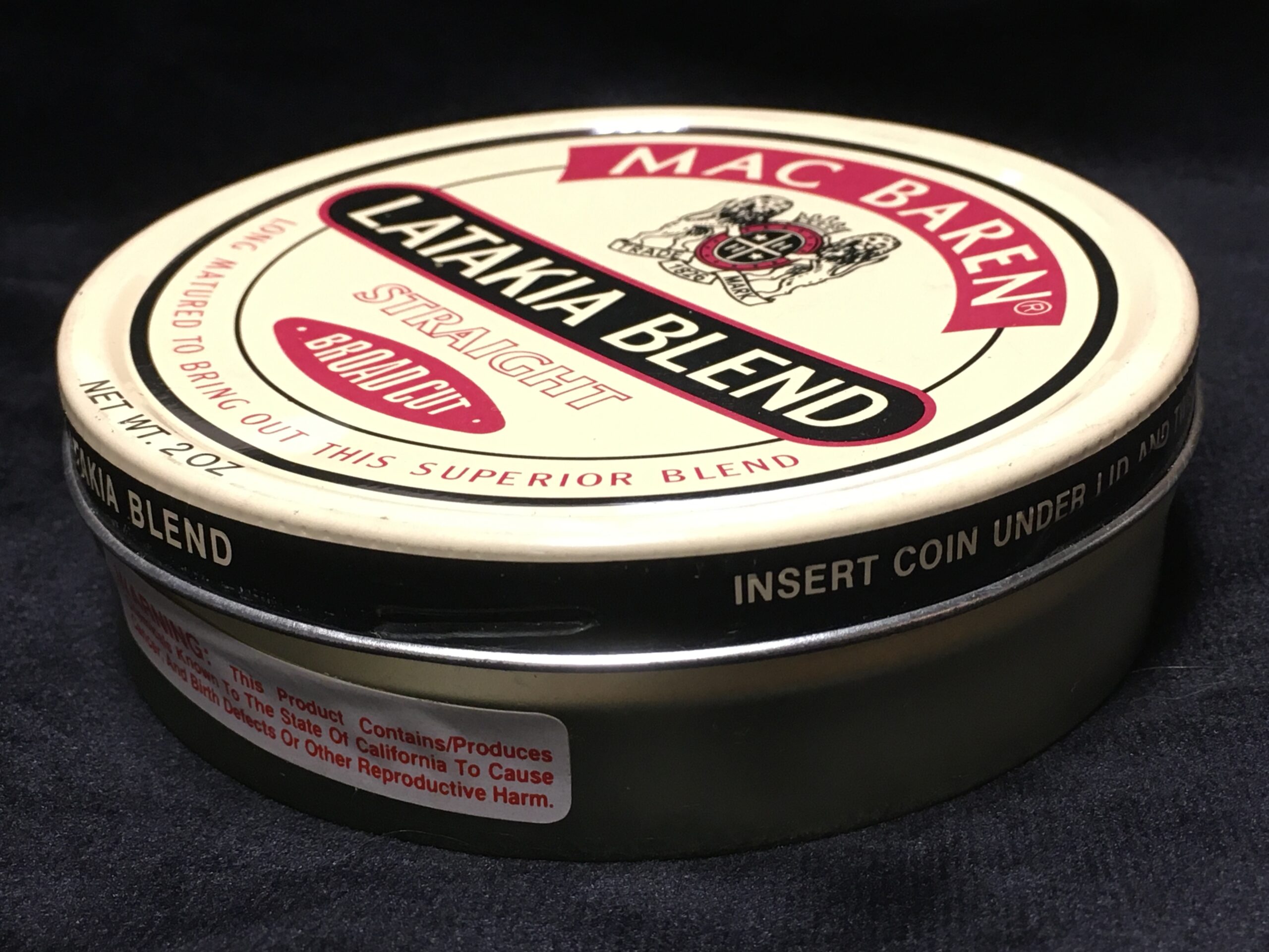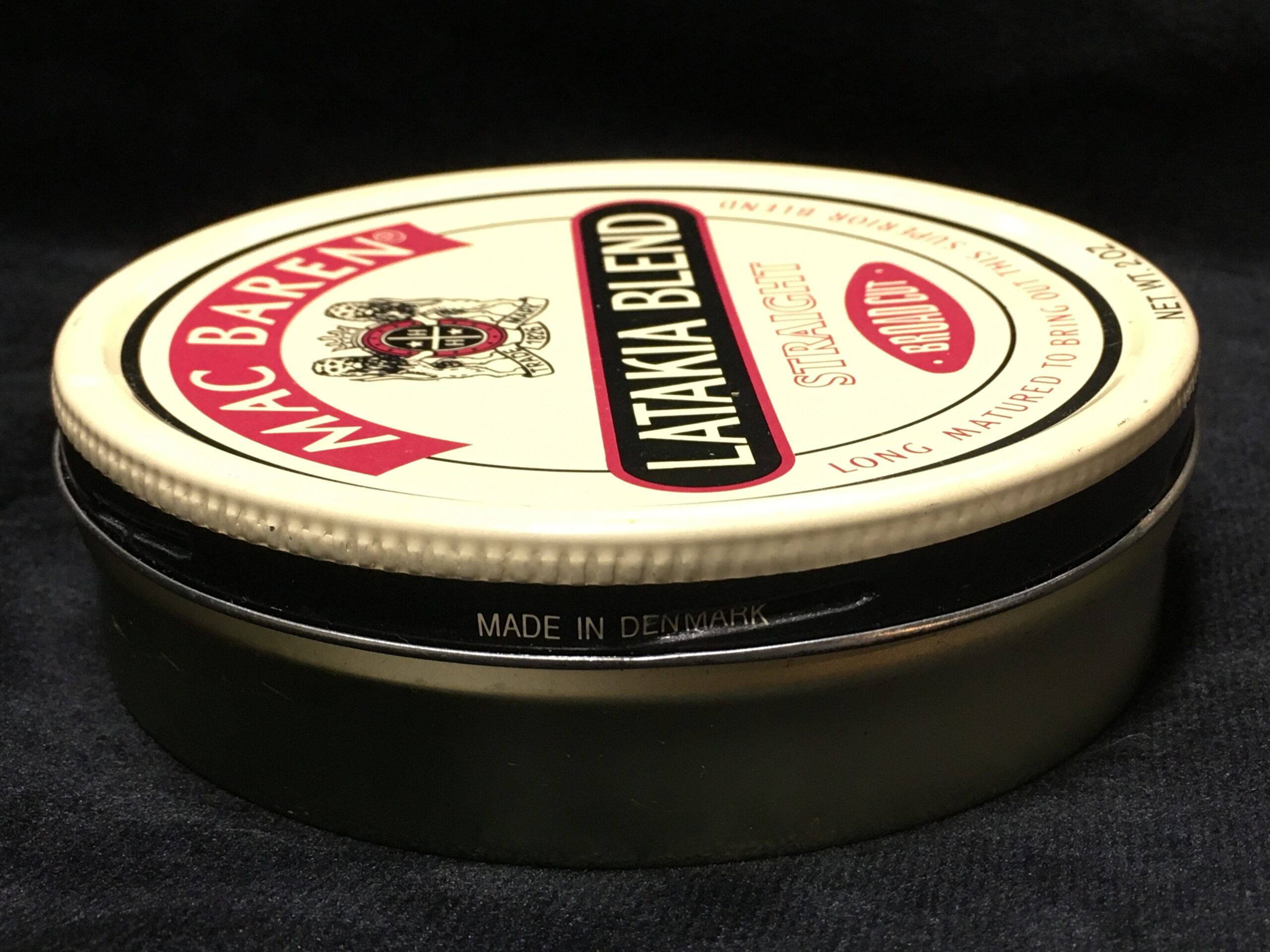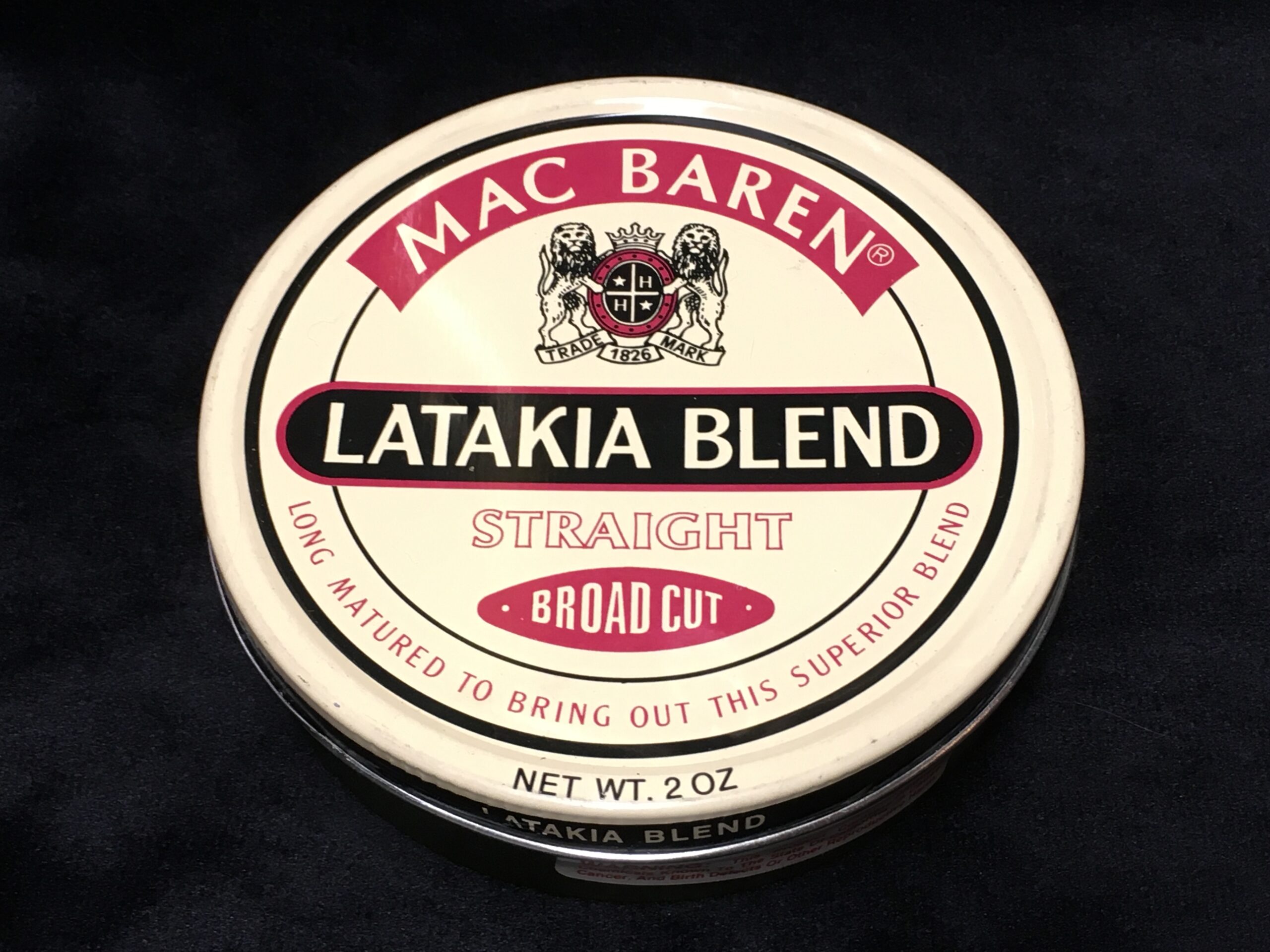 Vintage Mac Baren, LATAKIA BLEND - STRAIGHT BROAD CUT pipe tobacco, sealed tin. NET WT. 2 OZ Post "Mac Baren's" logo, but with fully painted lid. Health warning decal on the canister side, but no bar code, etc. ... likely 1990s to 2000s.