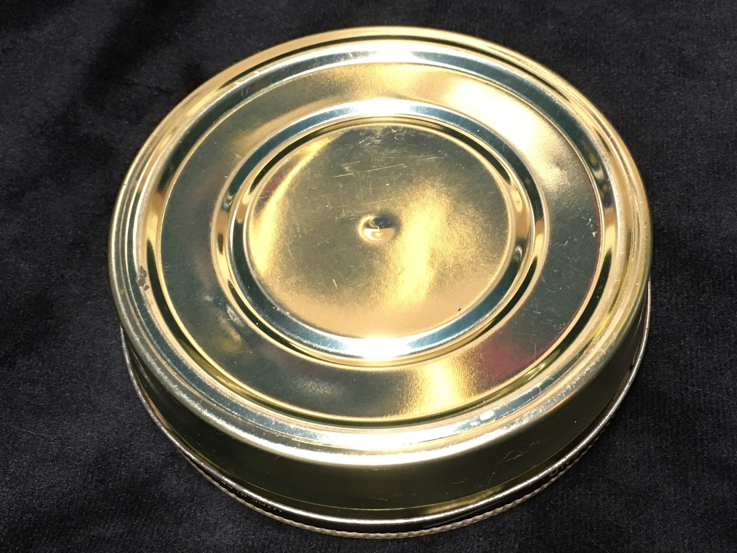 Tin was very well kept, minimal oxidation on the underside rub-points, zero cracking, etc. VERY minor shelf wear with some minimal scratching or rub at the contact points. A few small little dents and dings on the lid, and one little dent on the underside.