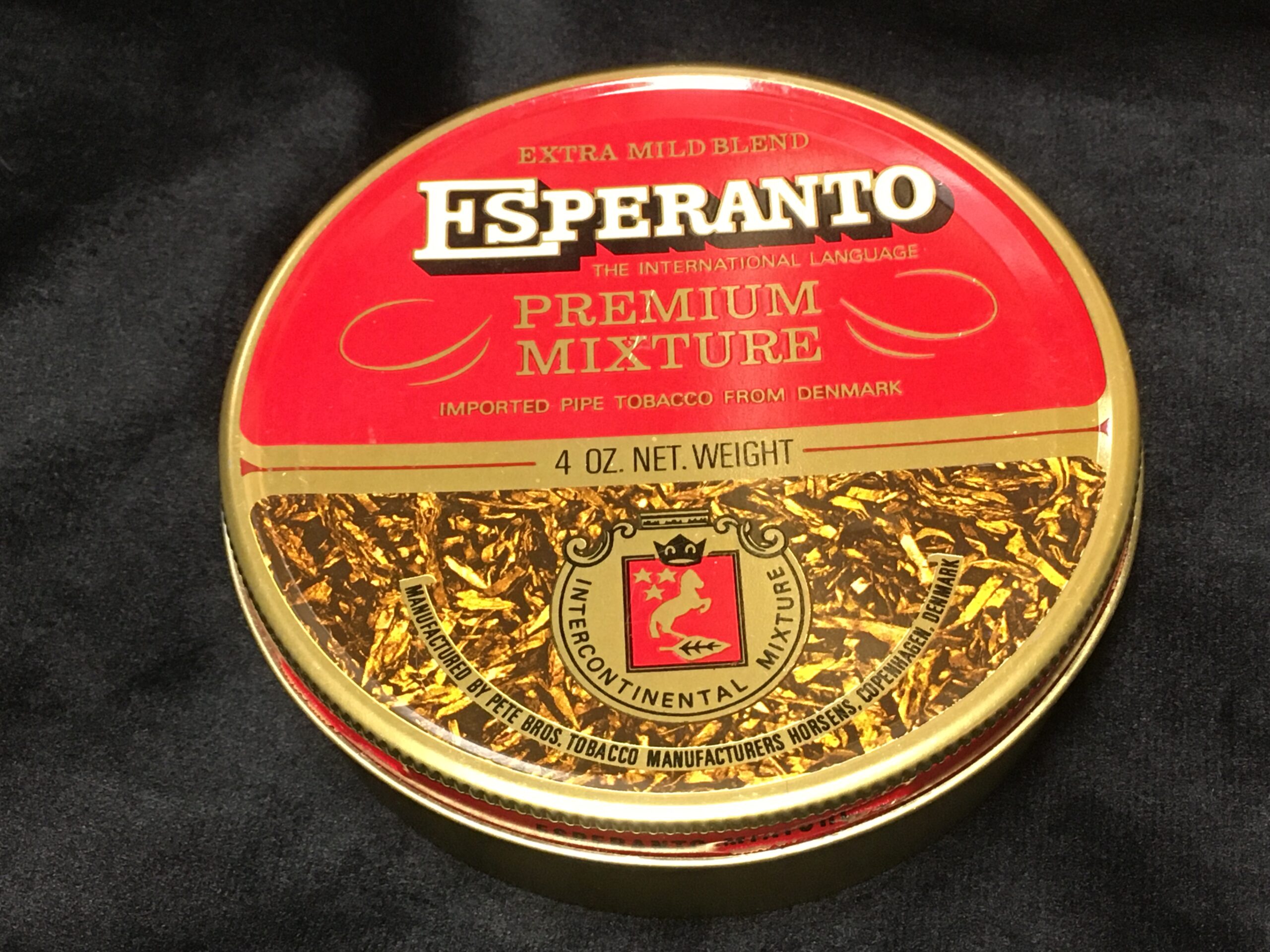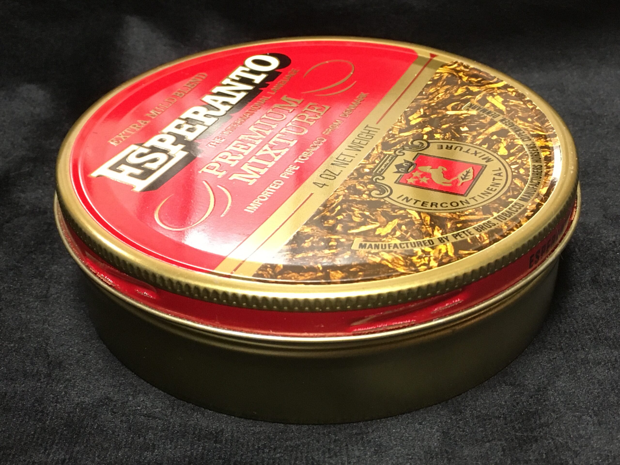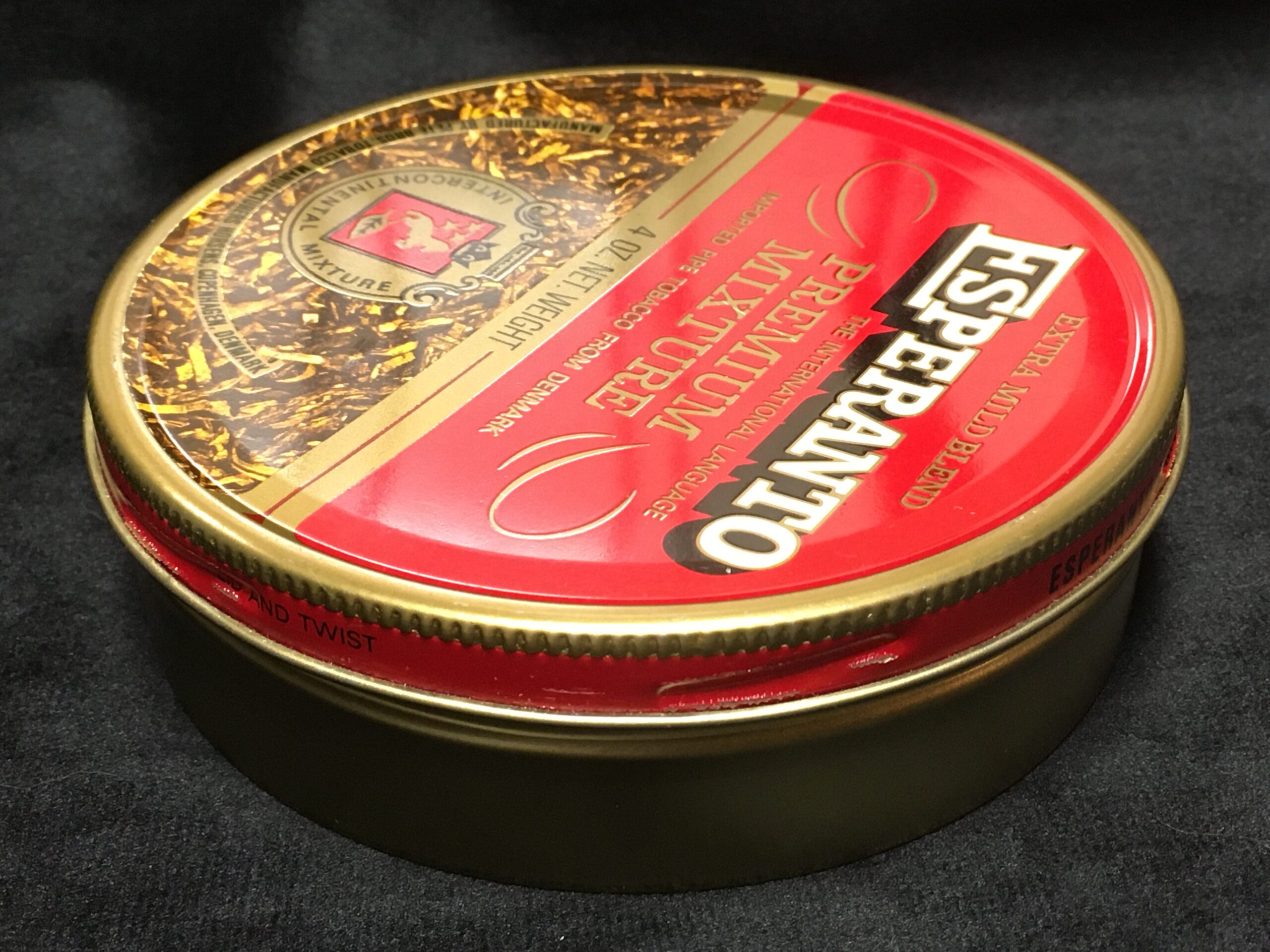 Vintage ESPERANTO The International Language PREMIUM MIXTURE pipe tobacco, sealed tin. 4 OZ. NET. WEIGHT. With fully painted lid, and no health warning, bar code, etc. ... likely 1990s.