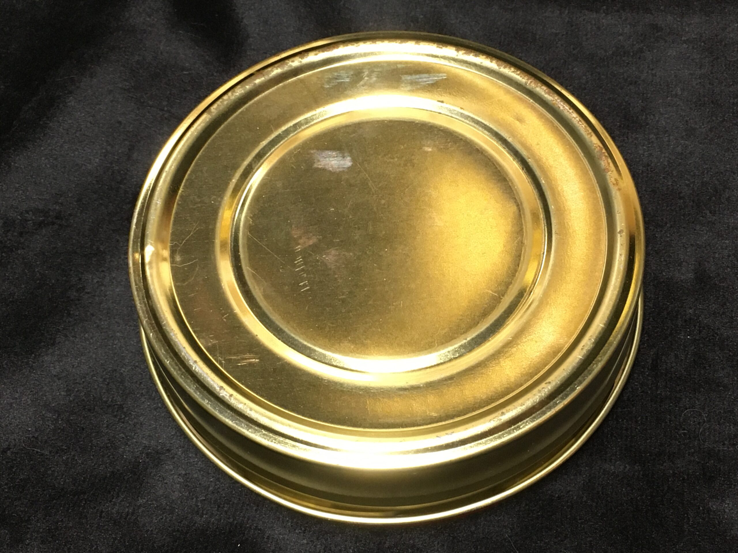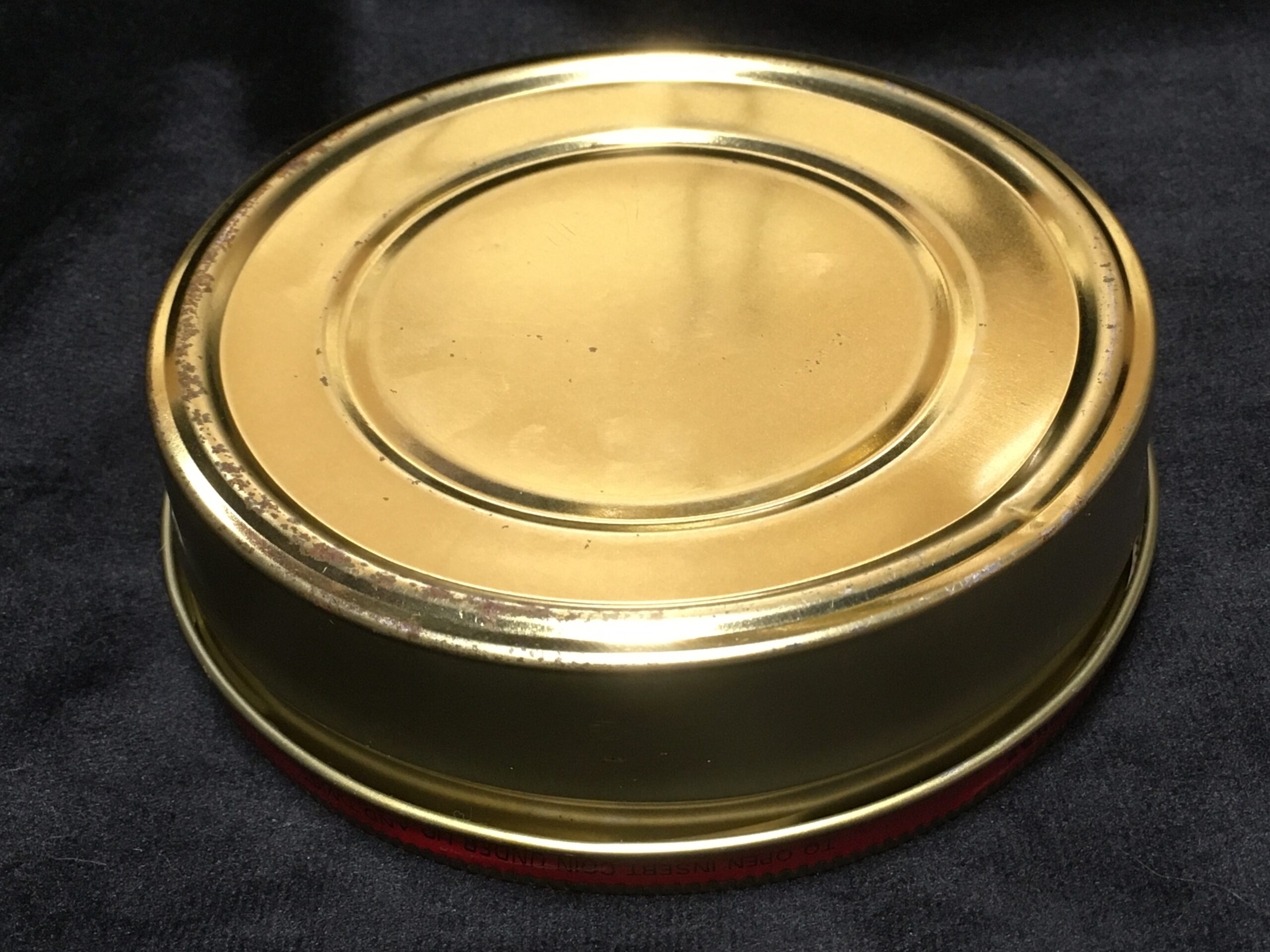Tin was very well kept, minimal oxidation on the underside rub-points, zero cracking, etc. Minor shelf wear with some minimal scratching or rub at the contact points. One little dent on the underside, near the edge.