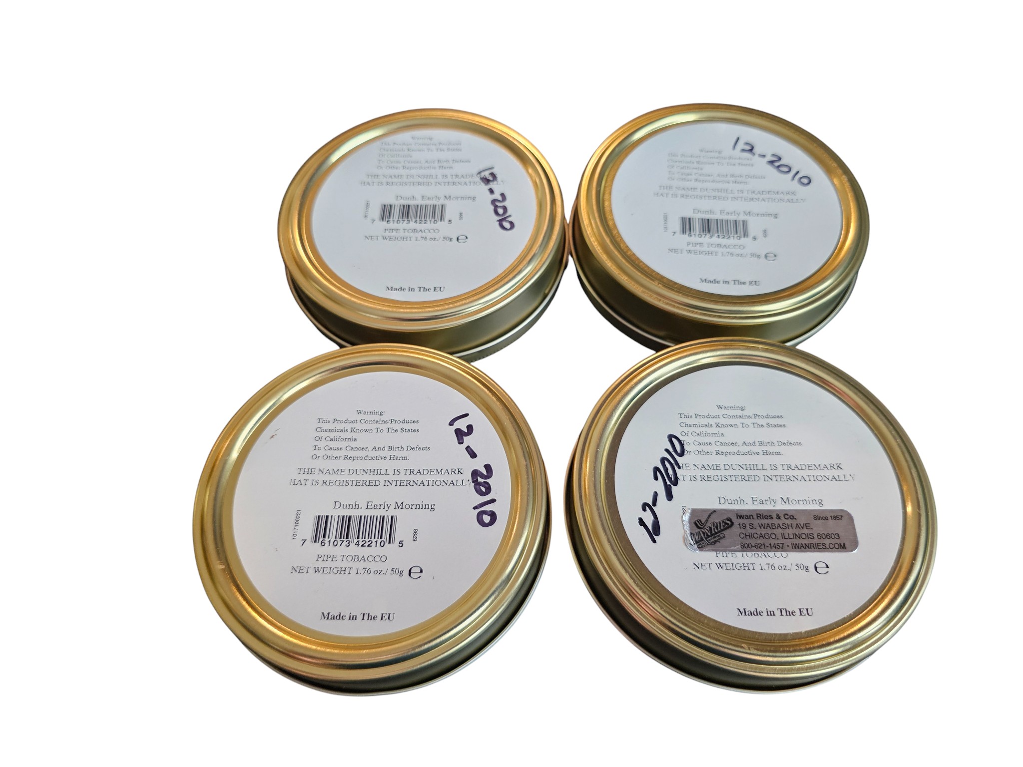 This is for four tins of Dunhill Early Morning with a production date of October 2010 and put-in-cellar dates of December 2010. These have been stored in a temperature-controlled environment.