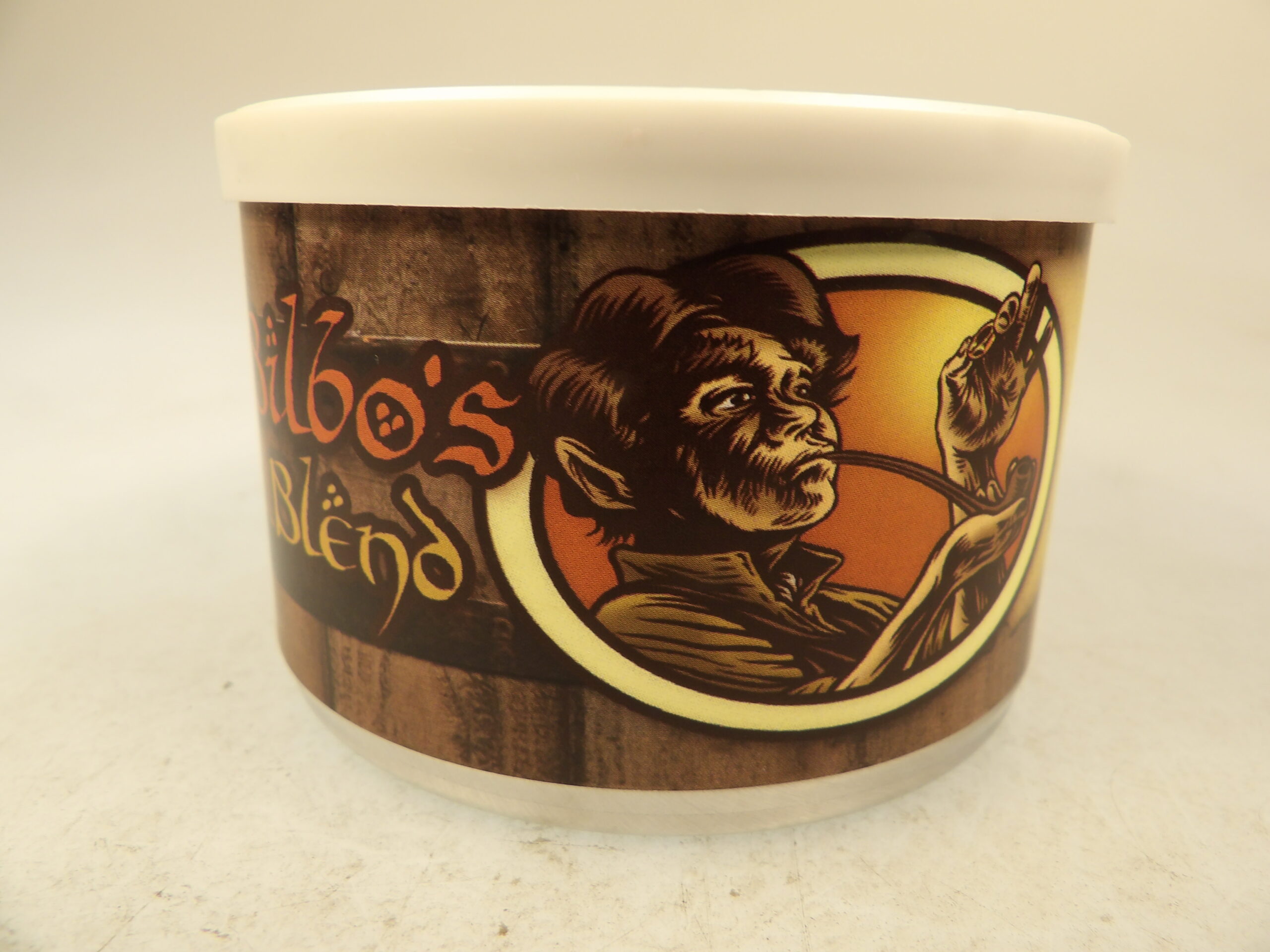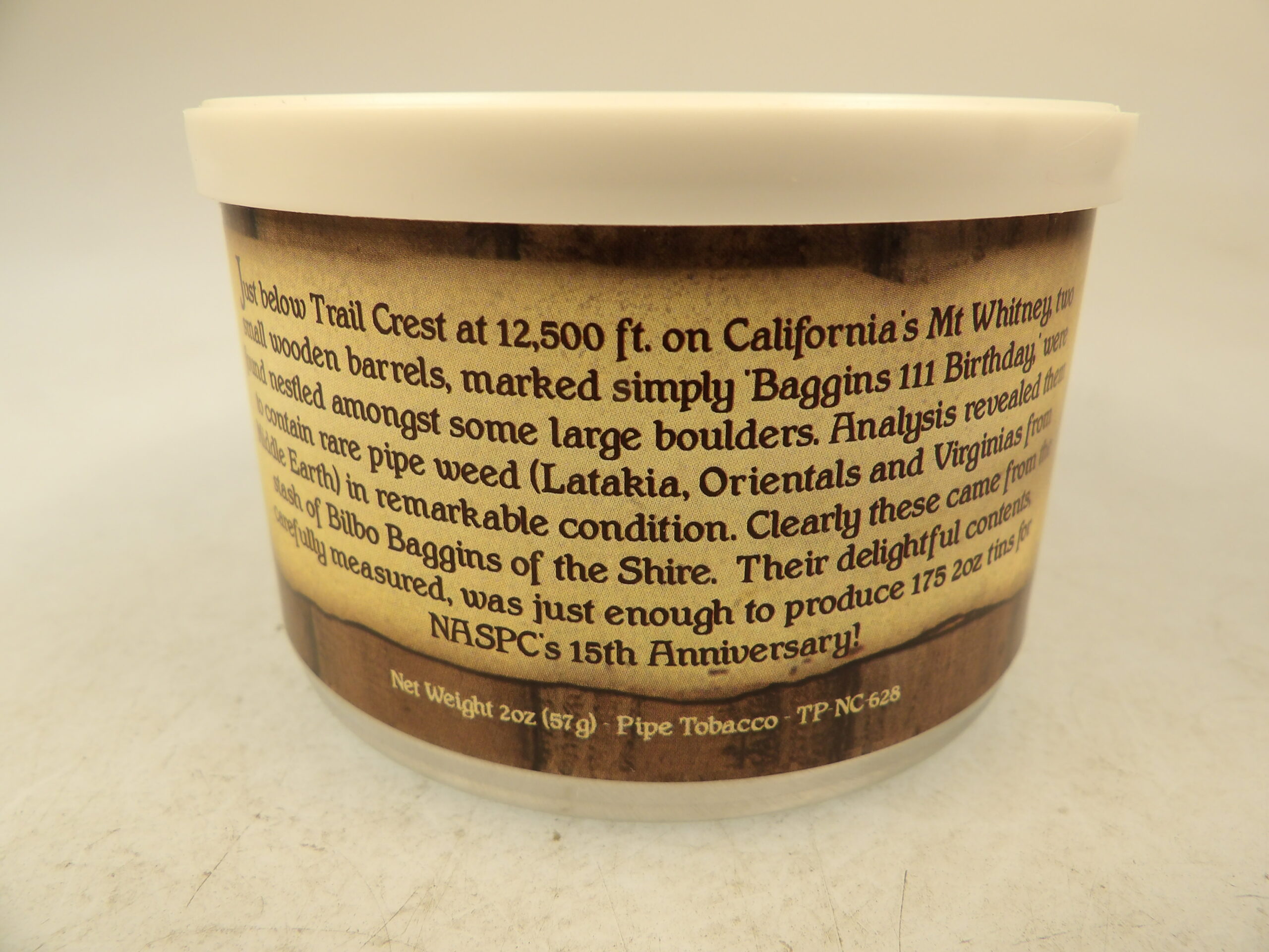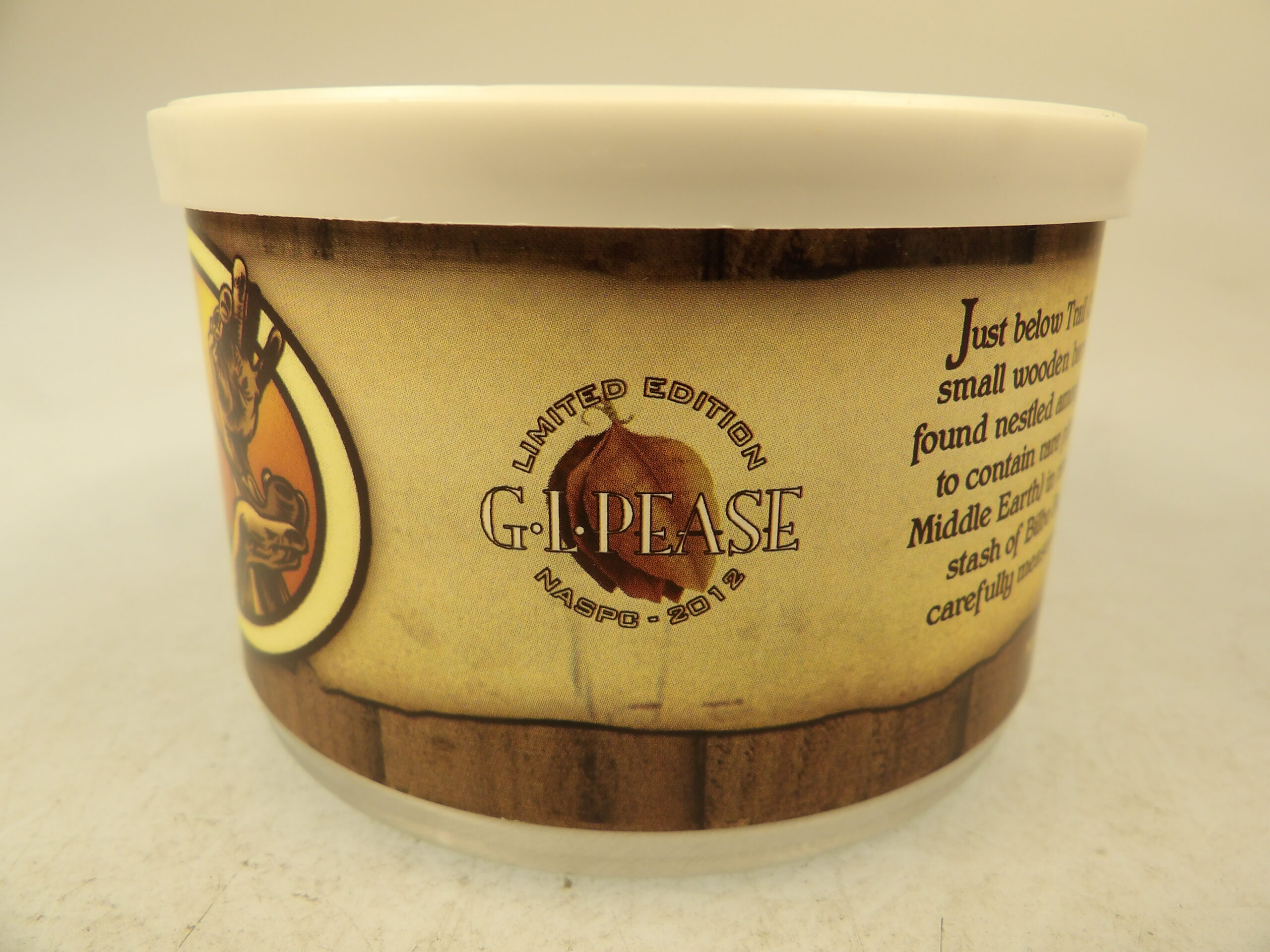 DESCRIPTION: Here is an auction for sale. It is a Vintage Collectible 13 Years Old G.L. Pease NASPC Bilbo’s Blend 2 oz’s Sealed Pipe Tobacco Tin Annual 2012 Show. This tin is sealed and has never been opened. This tin is a limited blend tin produced for this year only during the NASPC annual show. Just below Trail Crest at 12,500 ft. on California's Mt Whitney, two small wooden barrels, marked simply "Baggins 111 Birthday" were found nestled amongst some large boulders. Analysis revealed then to contain rare pipe weed (Latakia, Orientals and Virginias form middle earth) in remarkable condition. Clearly these came from the stash of Bilbo Baggins of the Shire. Their delightful contents, carefully measured, was just enough to produce 175 2 oz tins for NASPC's 15th Anniversary!