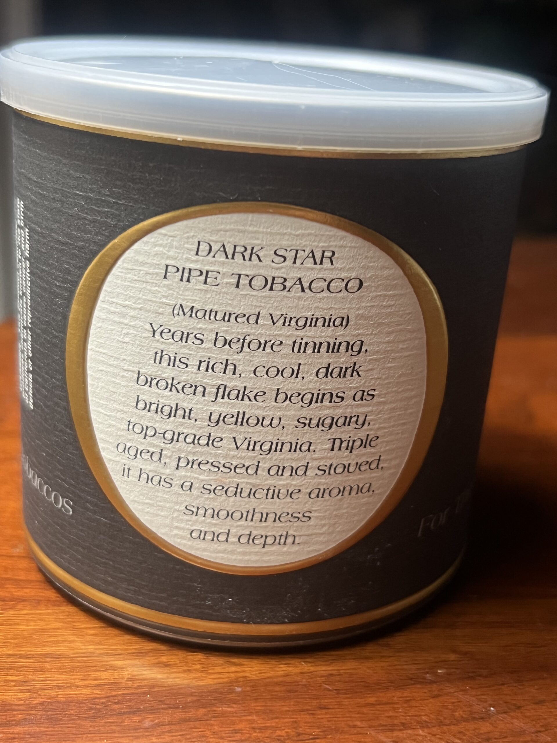 Years before tinning, this rich, cool, dark broken flake begins as bright, yellow, sugary, top-grade Virginia. Triple aged, pressed and stoved, it has seductive aroma, smoothness and depth.