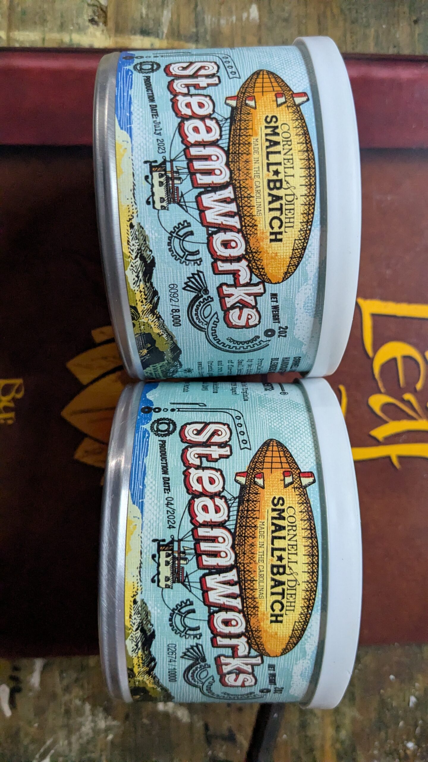 Cornell & Diehl's Small Batch: Steamworks is a complex Virginia/Oriental flake that explores the deep, natural sweetness of six exquisite flue-cured grades — ranging from deep Mahogany to brighter Lemon/Orange crops — enhanced by two distinct steaming processes. Presented in unsteamed, partially steamed, and blackened formats, these top-tier Virginia grades combine with a selection of vintage, heirloom Orientals, including Black Sea Sokhoum leaf from 2005, and genuine Louisiana Perique from C&D's exclusive farm in St. James Parish, to create a naturally sweet, subtly spicy, and exhilarating smoking mixture with a rich, matured flavor right out of the tin.