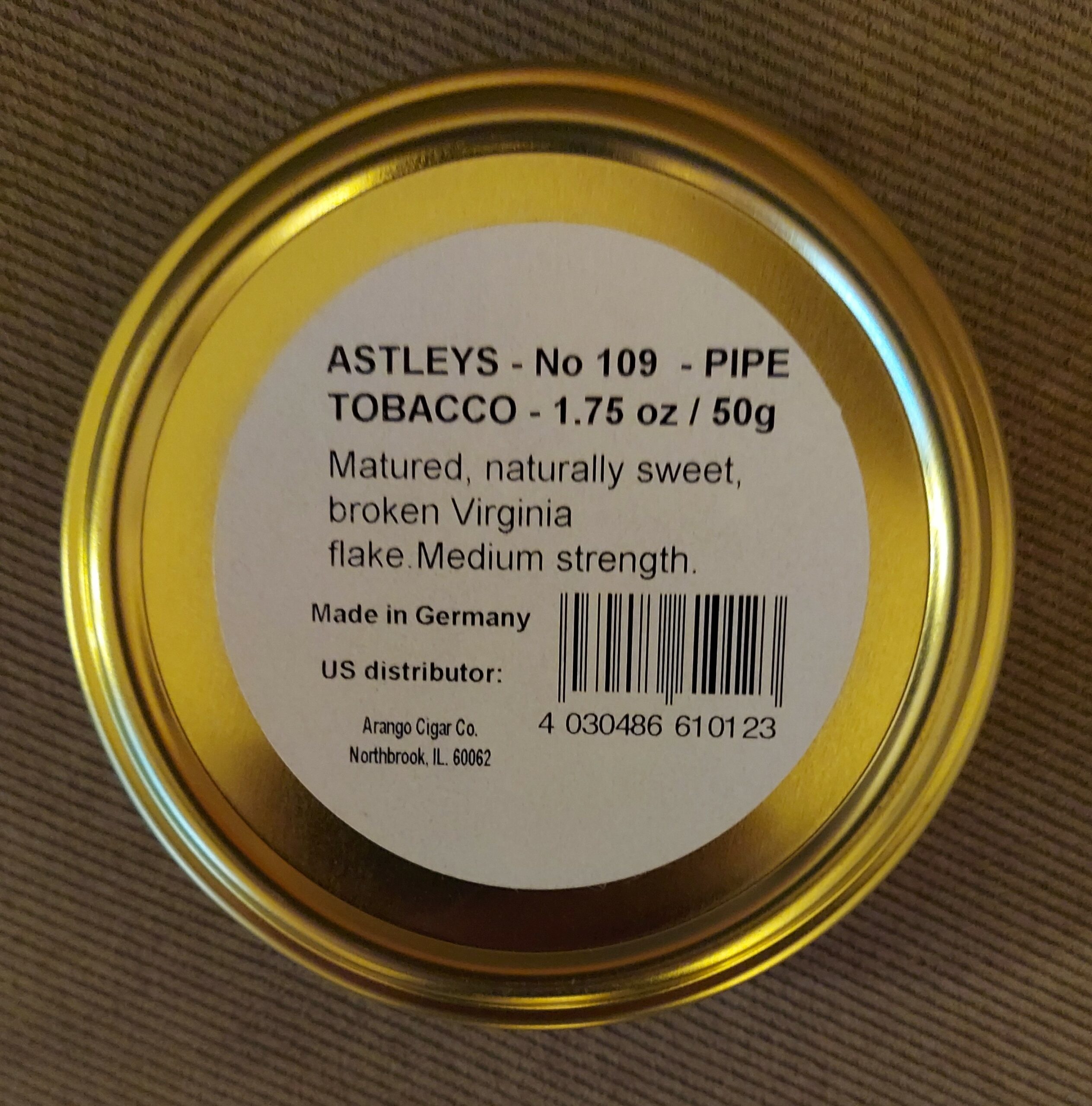 50g tin of Astley No. 109 Medium Flake. This is a great well aged Virginia blend. It does not have a date code but I purchased it in October 2012.
