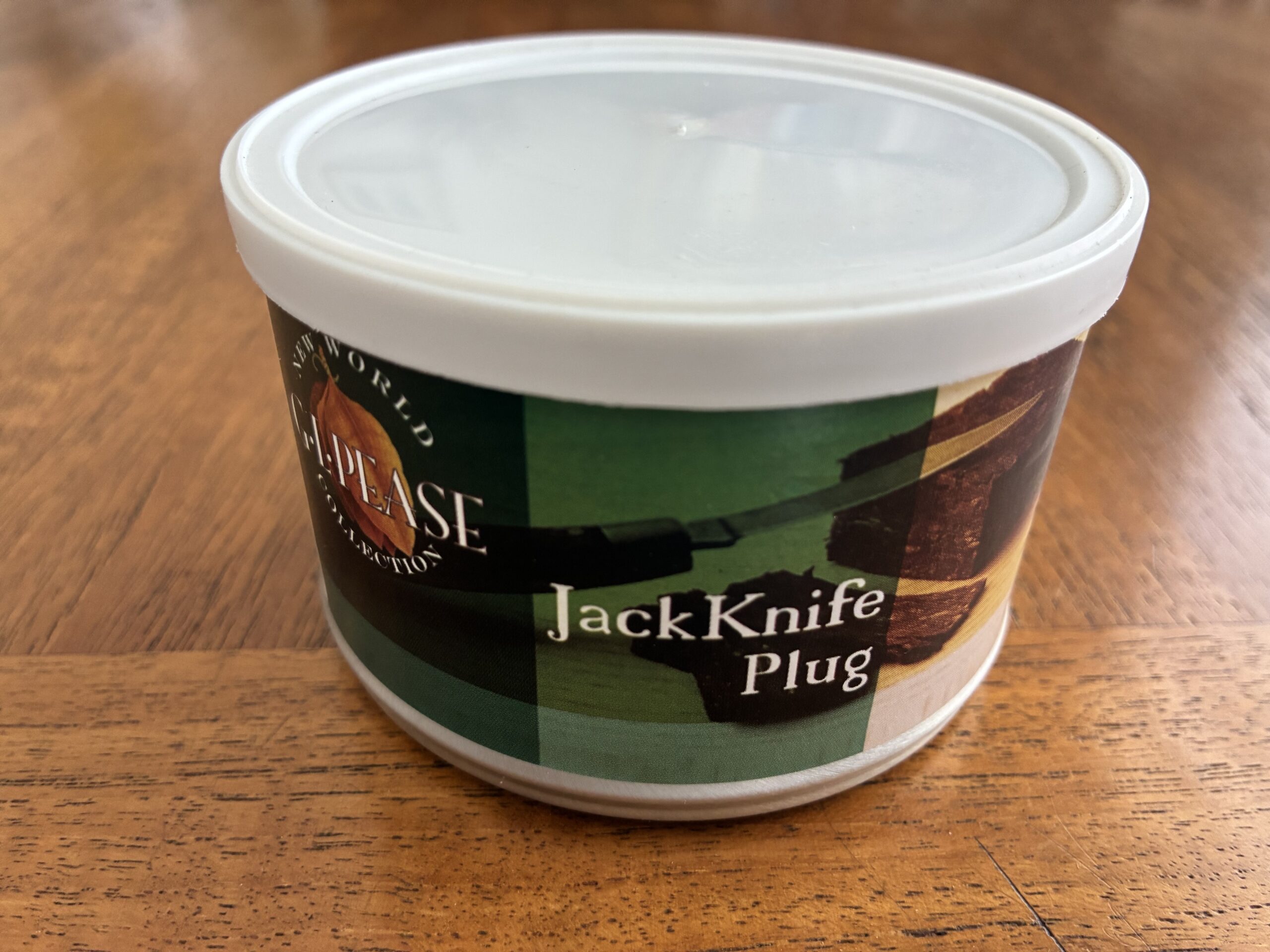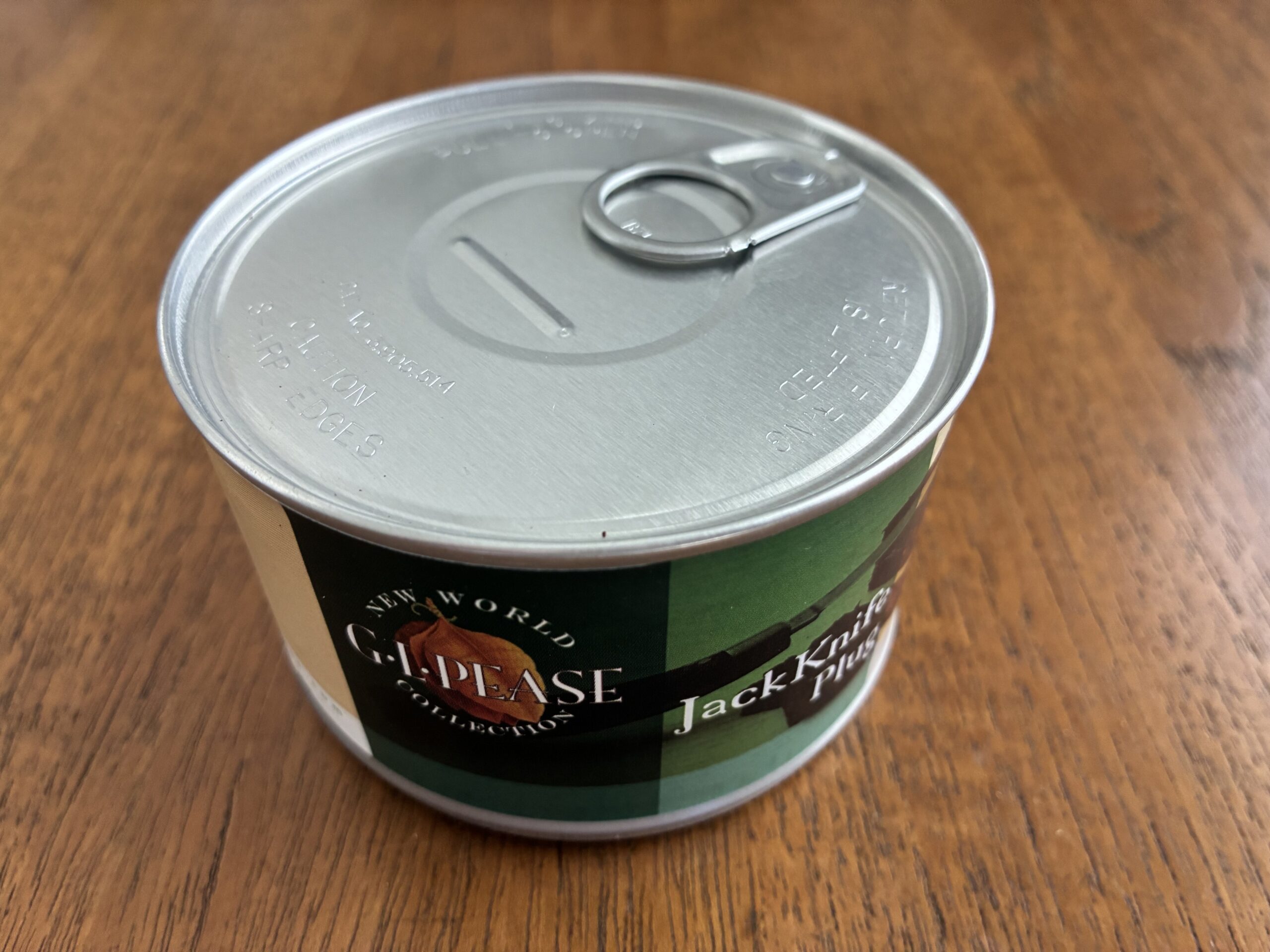 This is a sealed 2oz tin of G.L. Pease's JackKnife from 2015. A decade of age is sure to have improved this already legendary VA/DFK plug of tobacco. The tin has been cellared with care in a cool, dark environment since I purchased it directly from the tobacconist, and the seal remains completely intact. See photos for the lovely tin swelling indicating the aged goodness inside!