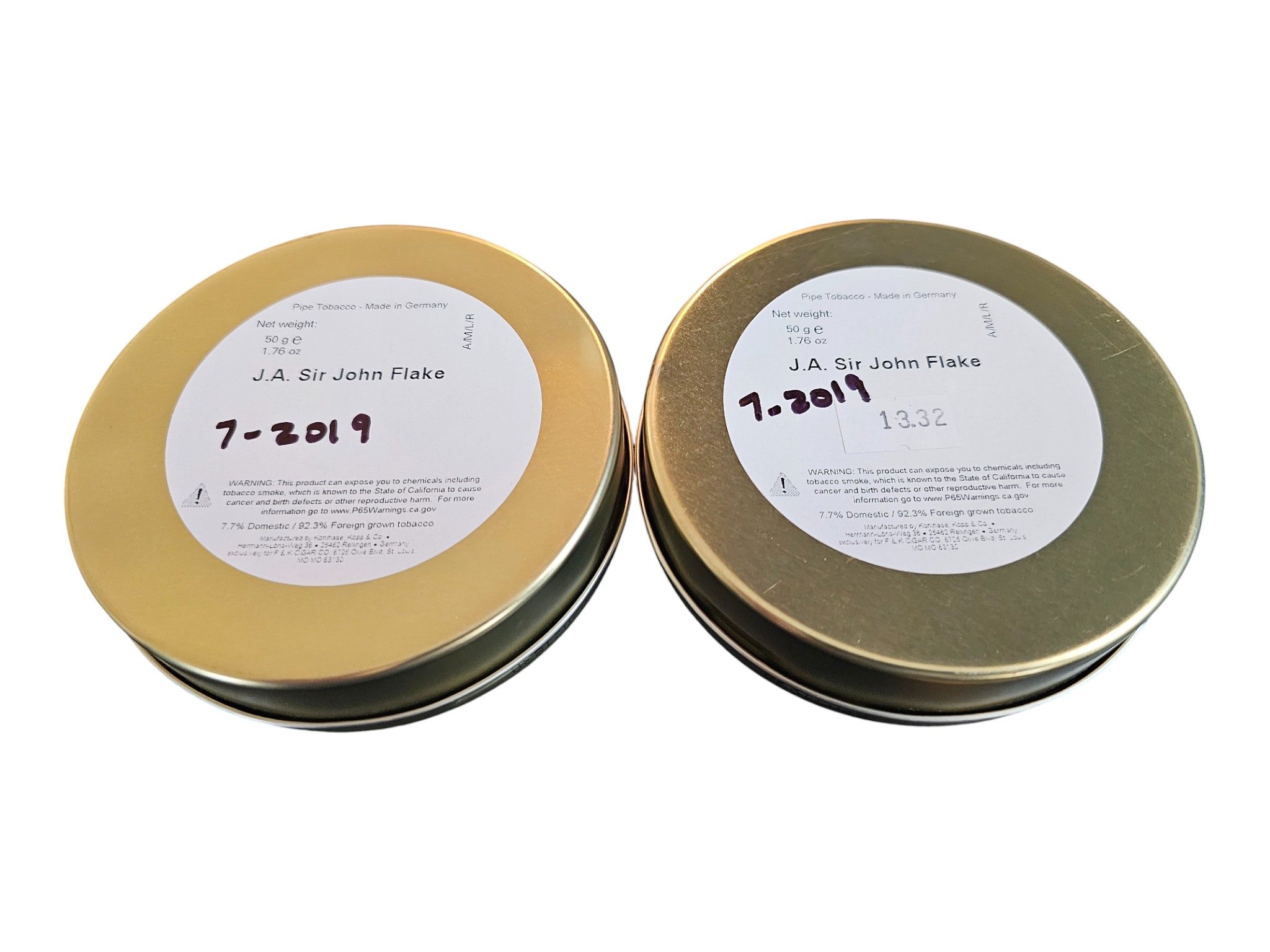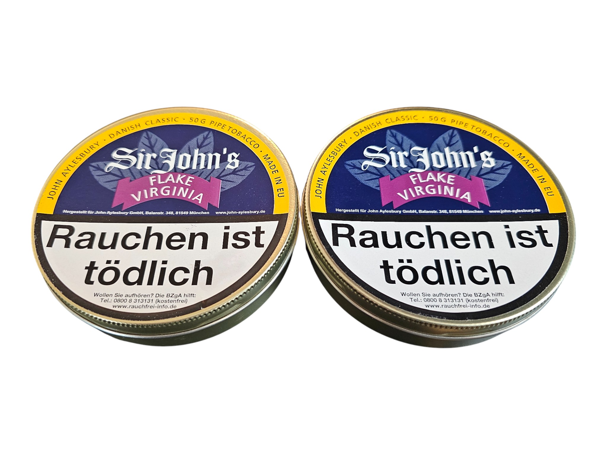 This is for two tins of John Aylesbury Sir John Flake Virginia, with a put-in-cellar date of July 2019 and a production date most likely 2019. These have been stored in a temperature-controlled environment.