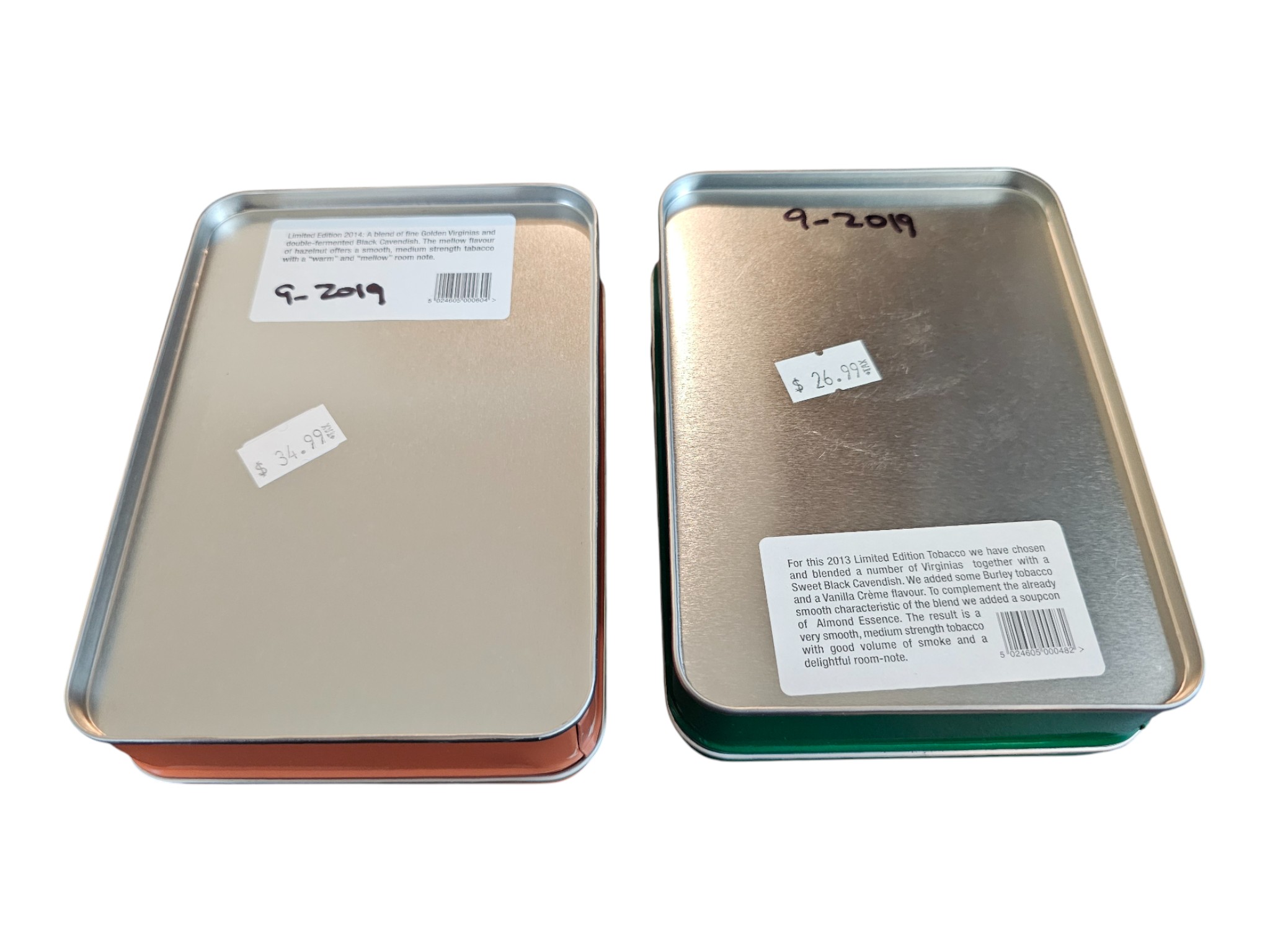 This is for two tins of Samuel Gawith Limited Edition. One has a production date of 2013, and the other was produced in 2014. They both have a put-in-cellar date of September 2019. These have been stored in a temperature-controlled environment.