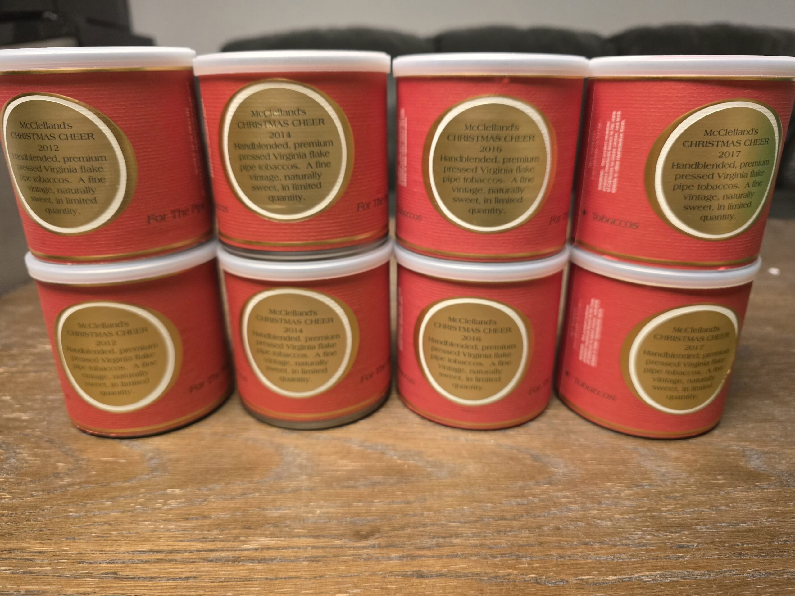 2 tins of each year - 2012, 2014, 2016, and 2017. 4 of the tins are starting to bulge.