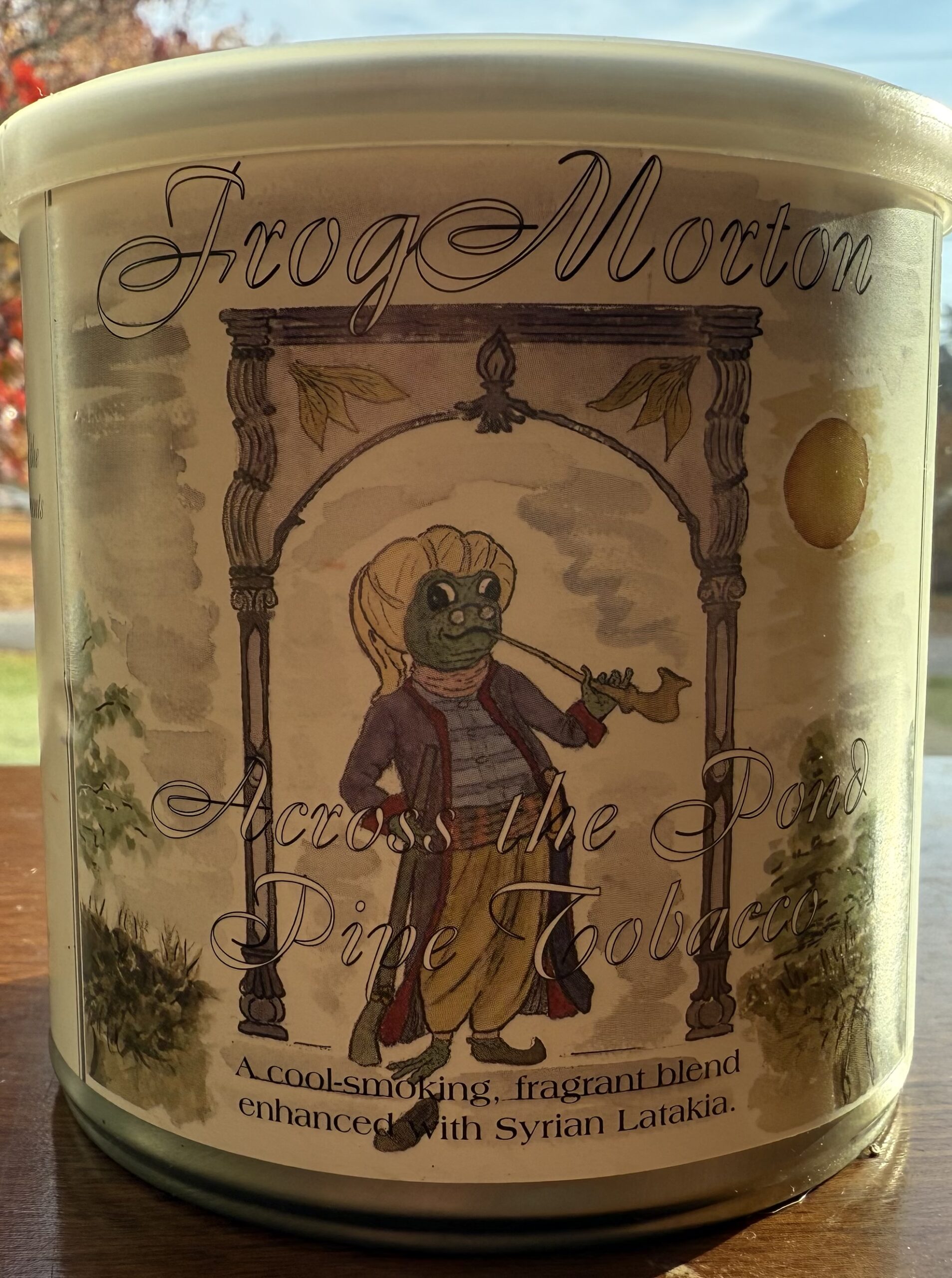 A pristine tin (expertly cellared and a lightless, climate and moisture controlled space) of McClelland’s Frog Morton Across the Pond, measuring 100g.