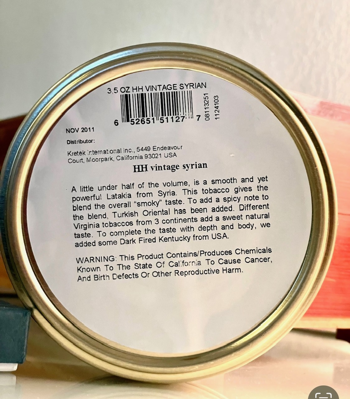This auction is for one sealed tin of Mac Baren HH Vintage Syrian (3.5OZ) 2011. The tin is in perfect condition and is sealed. The tin is dated Nov 2011.