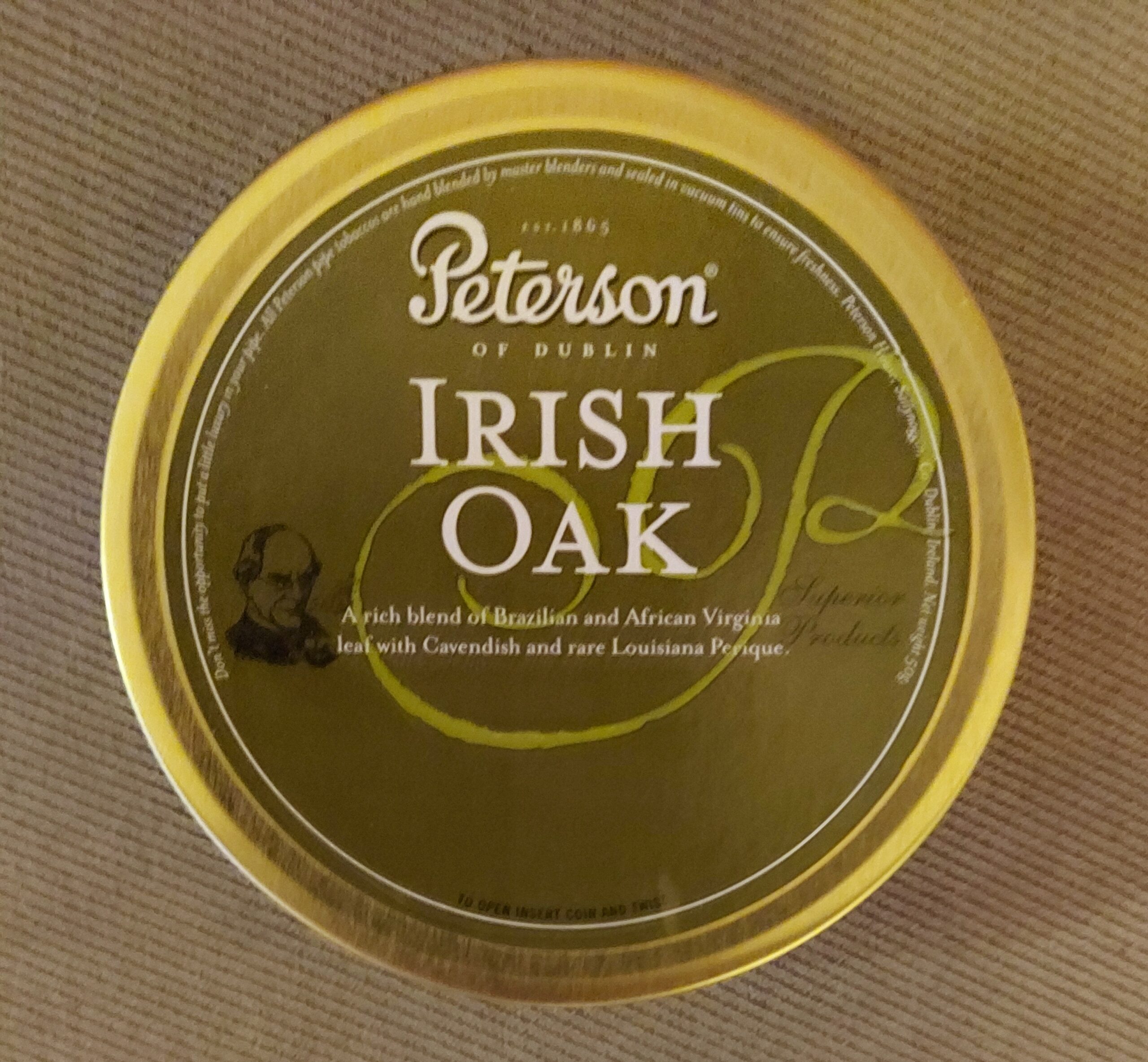 50g tin of Peterson Irish Oak. Well aged. No date code but I purchased it in 2009.