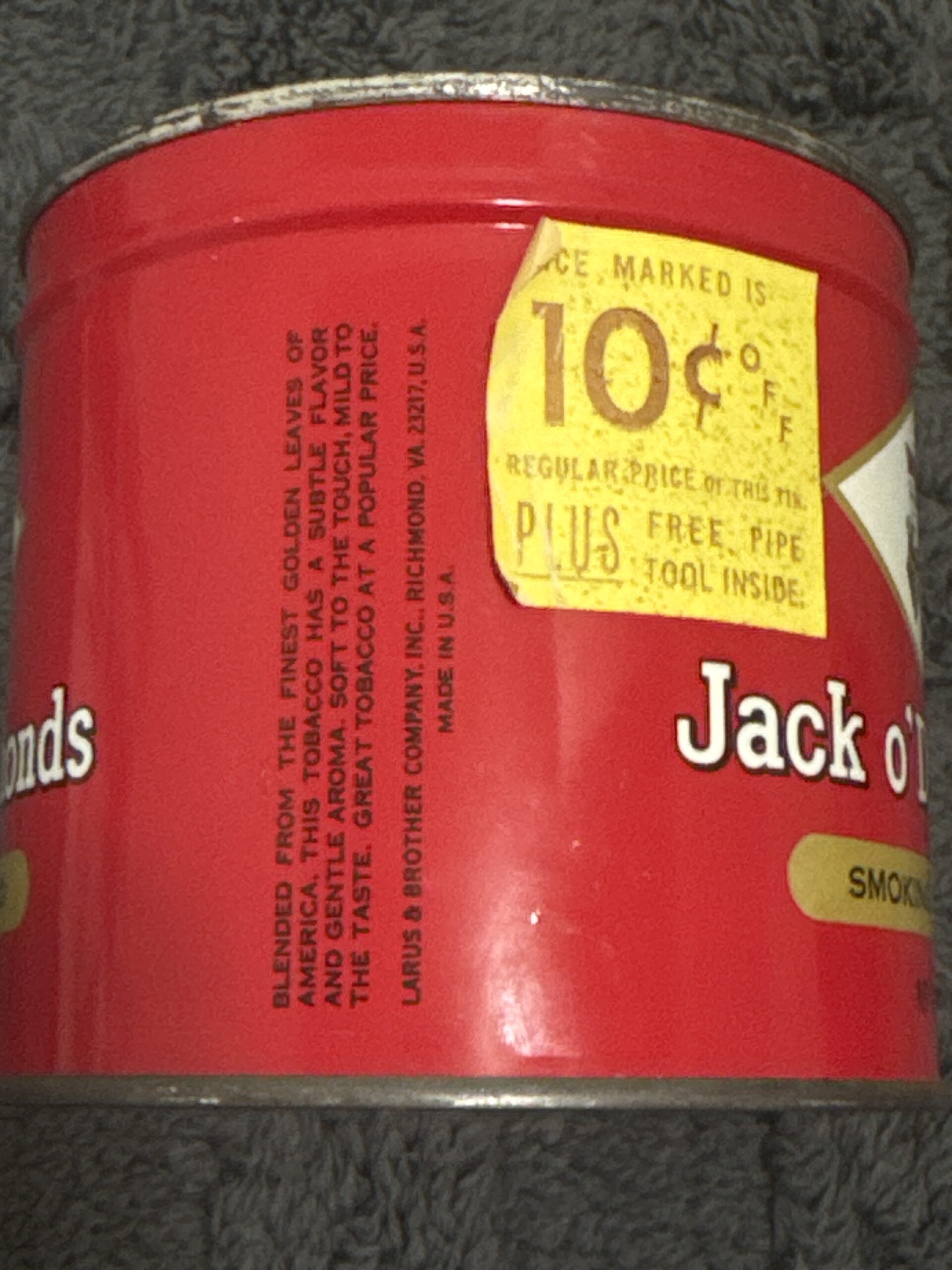Blended from the finest golden leaves of America this tobacco has a subtle flavor and gentle aroma Soft to the touch. mild to the taste. Antique metal paint cans from the 1950s. seven ounces.