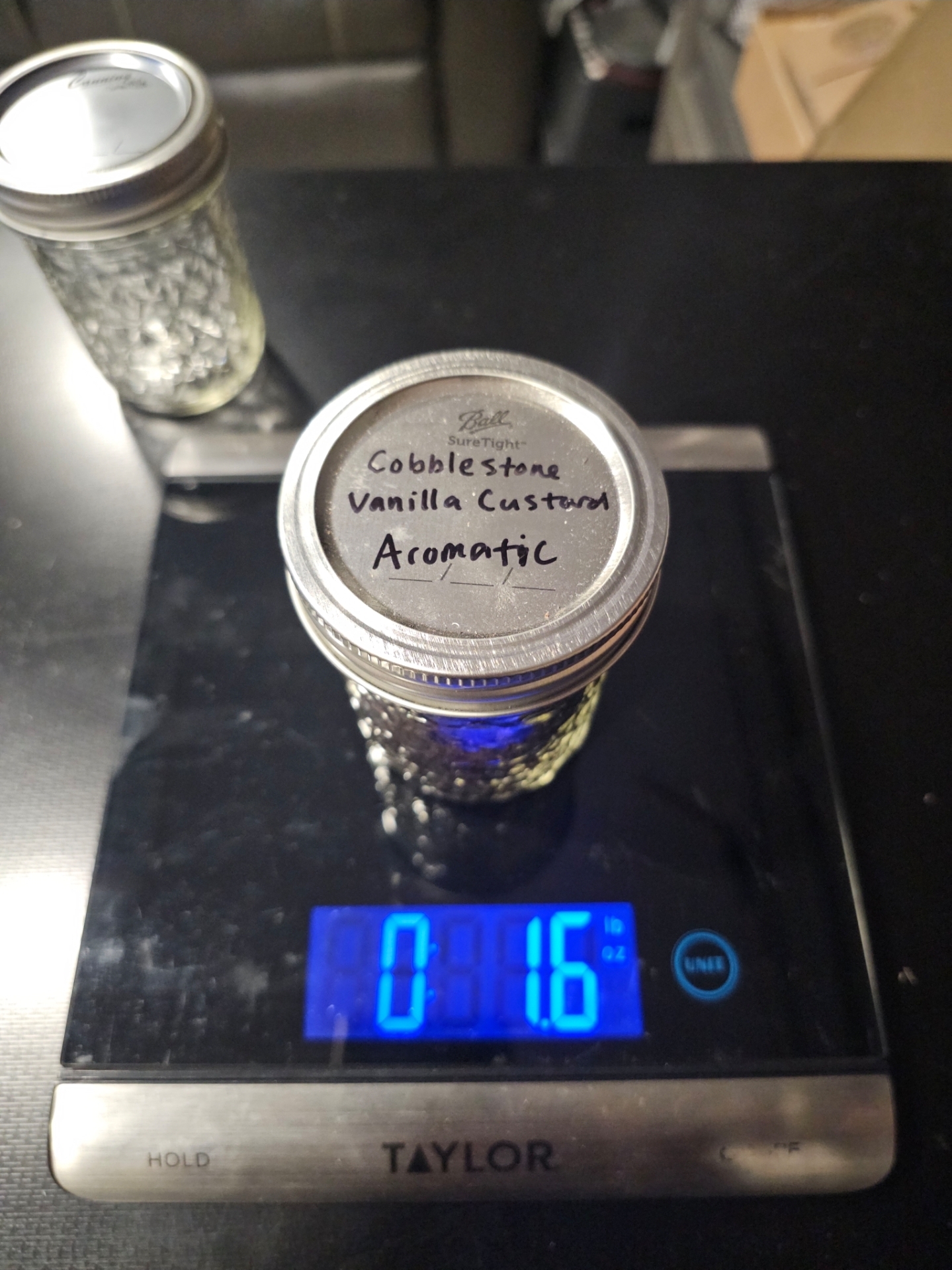 Weight of tobacco (in ounces) is shown on the scale in picture. The scale was set to zero with the weight of the jar and lid accounted for, so the shown weight is just the tobacco in the jar.