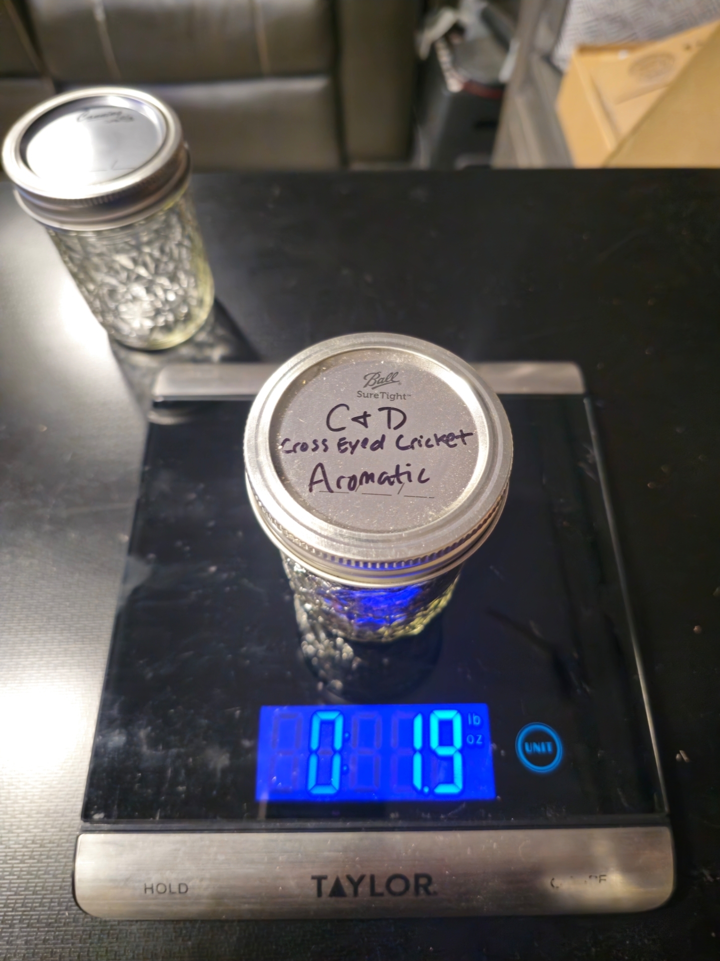 Weight of tobacco (in ounces) is shown on the scale in picture. The scale was set to zero with the weight of the jar and lid accounted for, so the shown weight is just the tobacco in the jar.