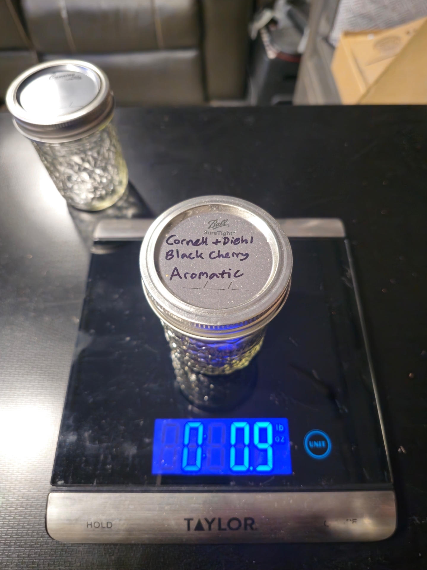 Weight of tobacco (in ounces) is shown on the scale in picture. The scale was set to zero with the weight of the jar and lid accounted for, so the shown weight is just the tobacco in the jar.