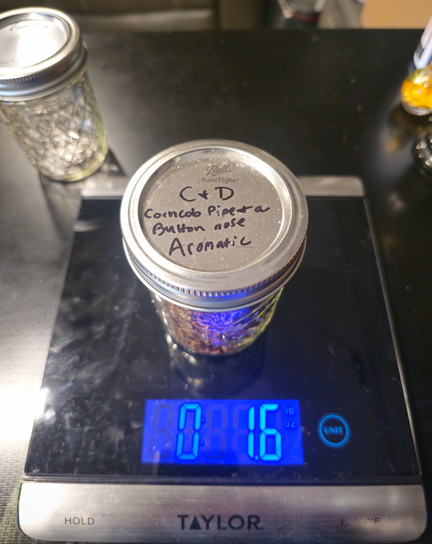 Weight of tobacco (in ounces) is shown on the scale in picture. The scale was set to zero with the weight of the jar and lid accounted for, so the shown weight is just the tobacco in the jar.