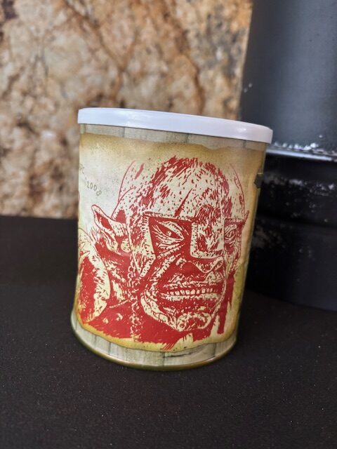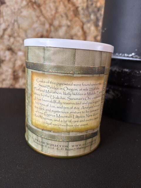 NASPC"s club tobacco for 2008 was Blend of the White Hand. It's a LOTR tribute tobacco, produced by GL Pease in a limited release of 300 2oz tins and 10 8oz tins. Here is one of the 10. It features a drawing of one of Saruman's Orcs.
