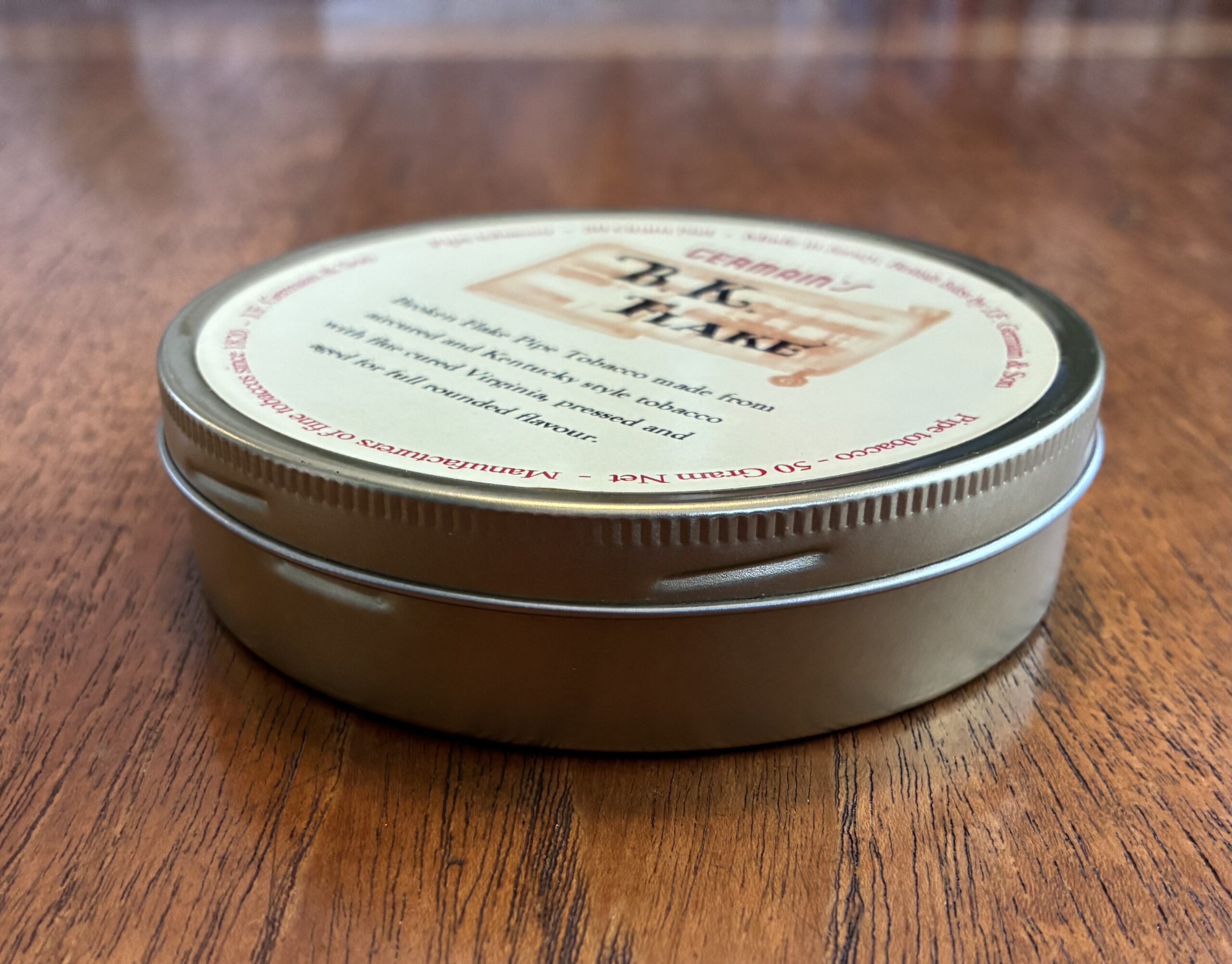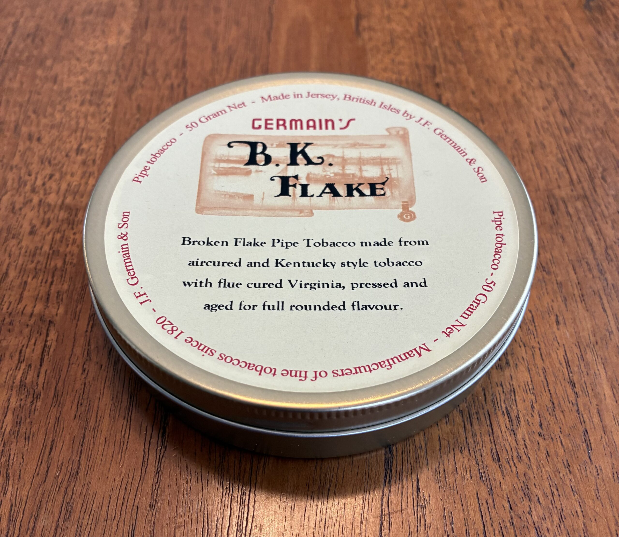A flawless, sealed 50g tin of Germain’s B.K. Flake, produced in Jersey by the legendary J.F. Germain & Son. This blend combines air-cured and Kentucky-style leaf with flue-cured Virginia, pressed and matured to create a balanced, rounded, flavorful smoke.