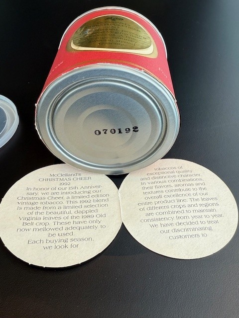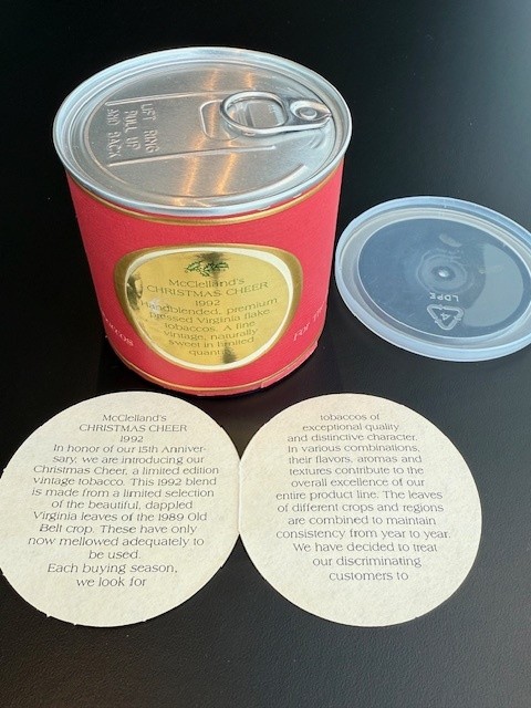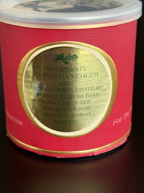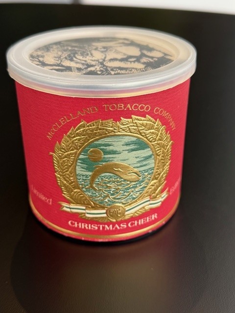 Sealed & unopened tin of 1992 McClelland's Christmas Cheer pipe tobacco. This is the first year of Christmas Cheer.