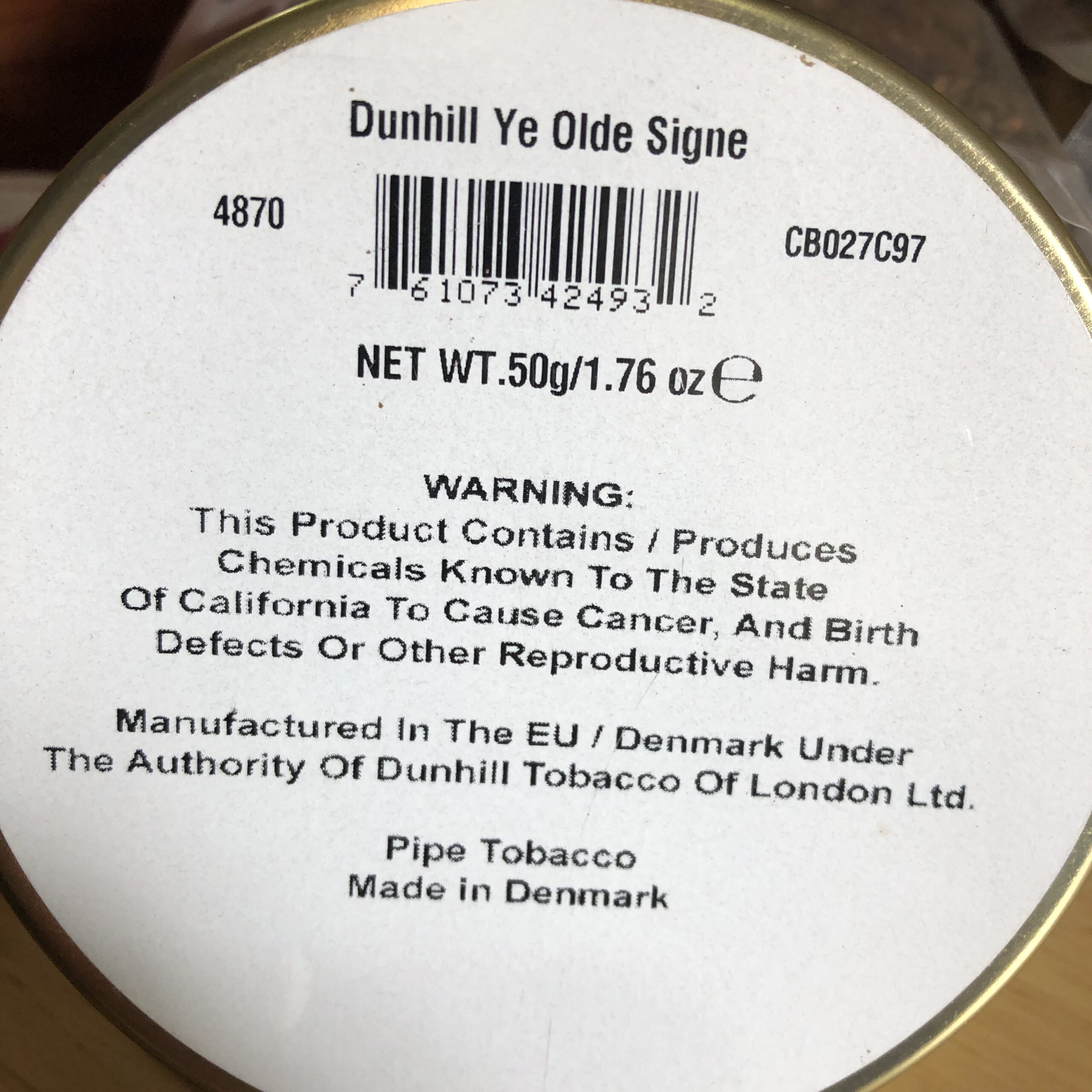 Dunhill Ye Olde Signe is a straight Virginia blend with a rich fermented quality. Though light with a hint of tea it does not disappoint in the nicotine department. I love this blend and as I have a few tins I decided to offer this one so others may experience it. Good luck bidding!