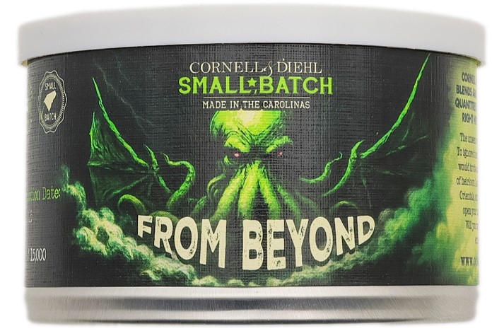 Taking inspiration from the popular, Lovecraftian The Old Ones series, Cornell & Diehl's Small Batch: From Beyond is a rich, potent, and incredibly complex English mixture that captures Head Blender Jeremy Reeves' impression of a wonderfully aged, 1990s-era tin of Dunhill Nightcap. Balancing full flavor with robust strength, it's handcrafted using a host of rare tobacco varietals: Eastern NC Red Virginias (2017), Bright Canadian Virginias (2022), Thai Izmir (2019), Turkish Latakia, Greek Basma (2022), and heirloom Cyprian Latakia (2004). The flavor is dark, rich, and subtly sweet with an smoky, incense-like quality evocative of shadows in the woods.