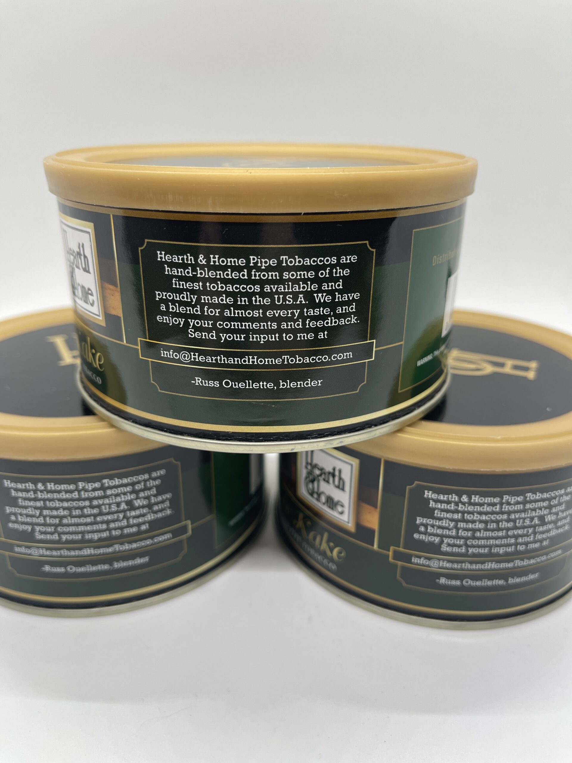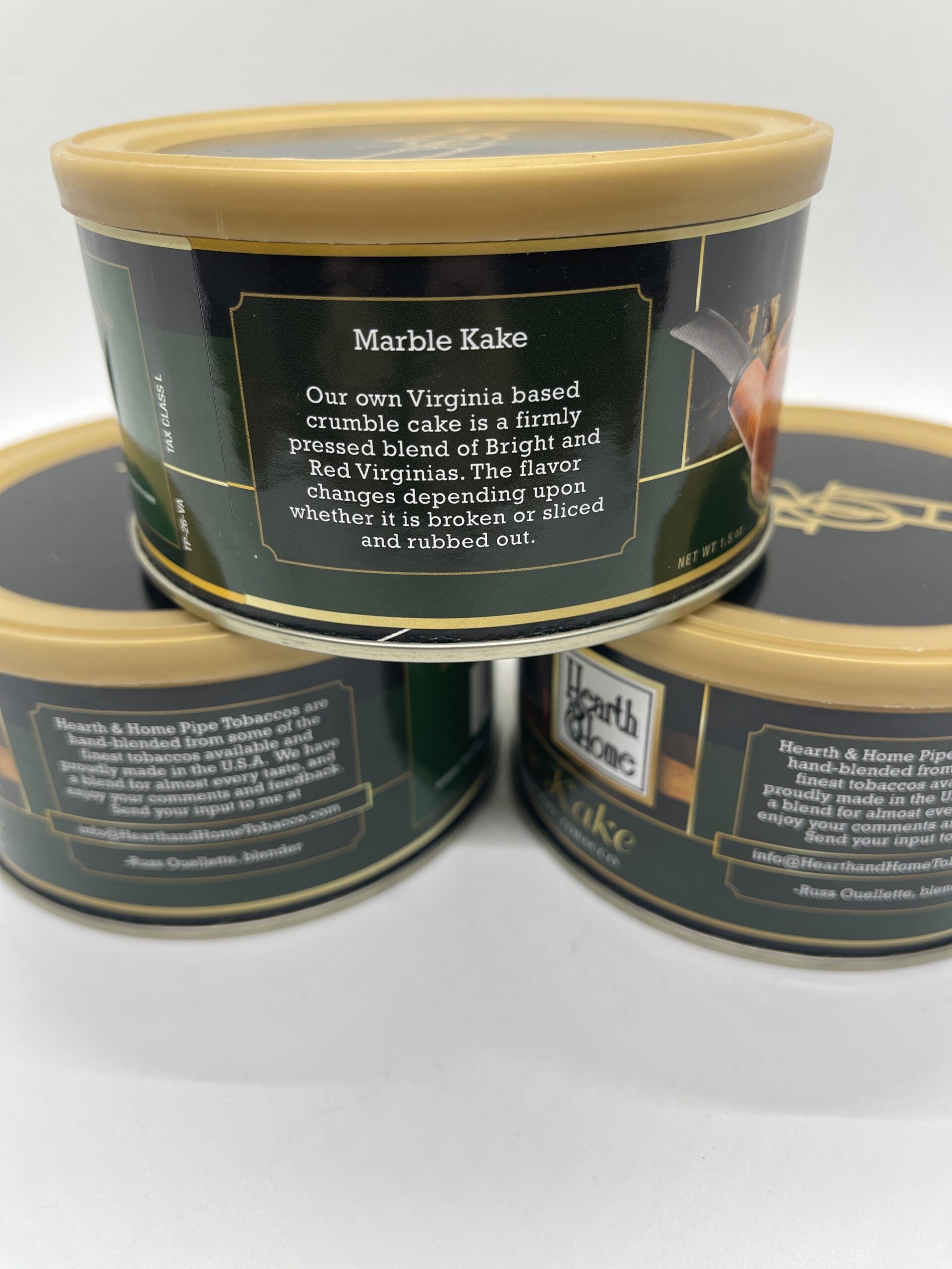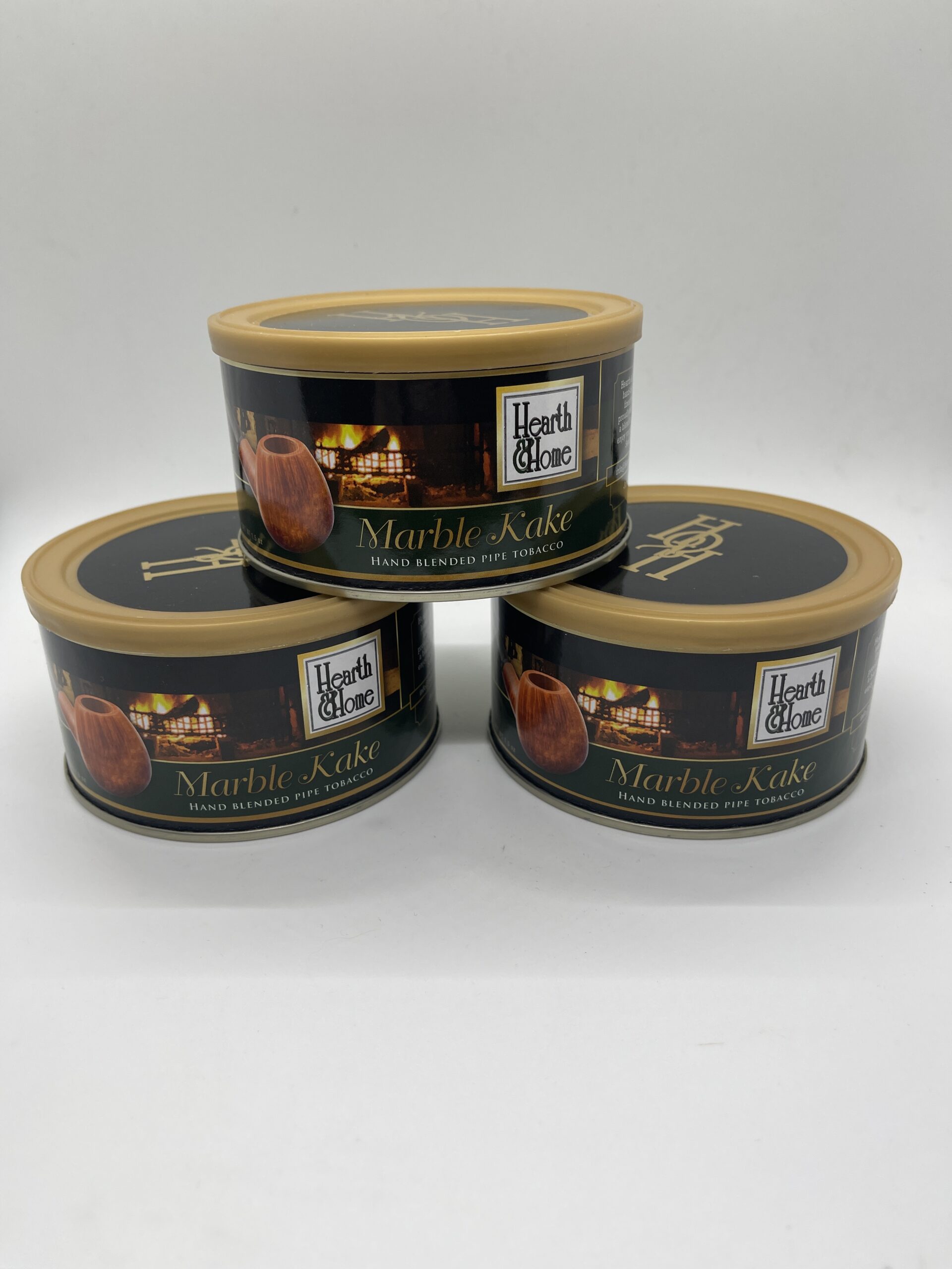 Three sealed tins Hearth & Home Marble Kake circa 2017.