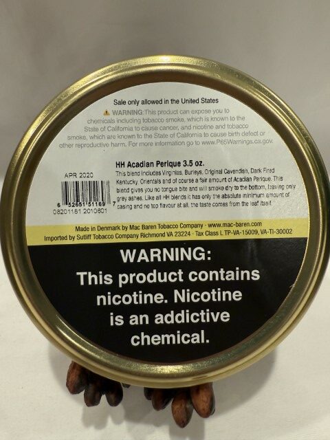 This blend includes Virginia, burley, original cavendish, dark fired Kentucky, Oriental and of course a fair amount of perique. The HH Acadian Perique has no top flavor at all which means that you will only enjoy the tobacco taste. When smoked you will experience no tongue bite and this blend will smoke to the bottom, leaving only dry ashes. It is a rich, flavorful and very satisfying smoke.