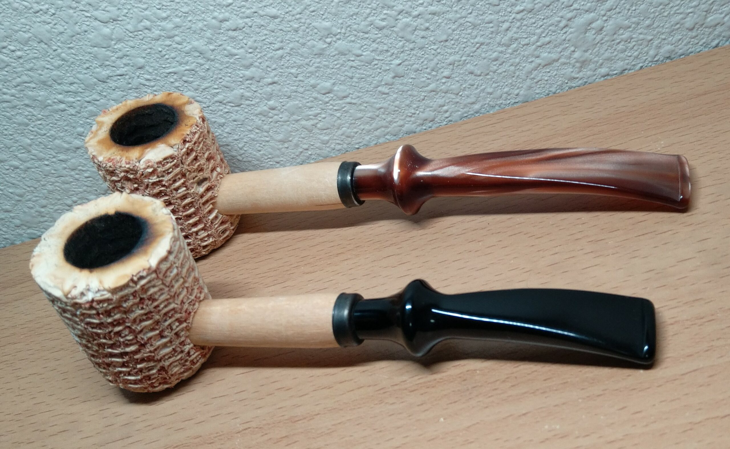 Two used MM Missouri Pride corn cob pipes with forever stems. Selling these mainly for the stems, but the Cobs are in decent useable condition.