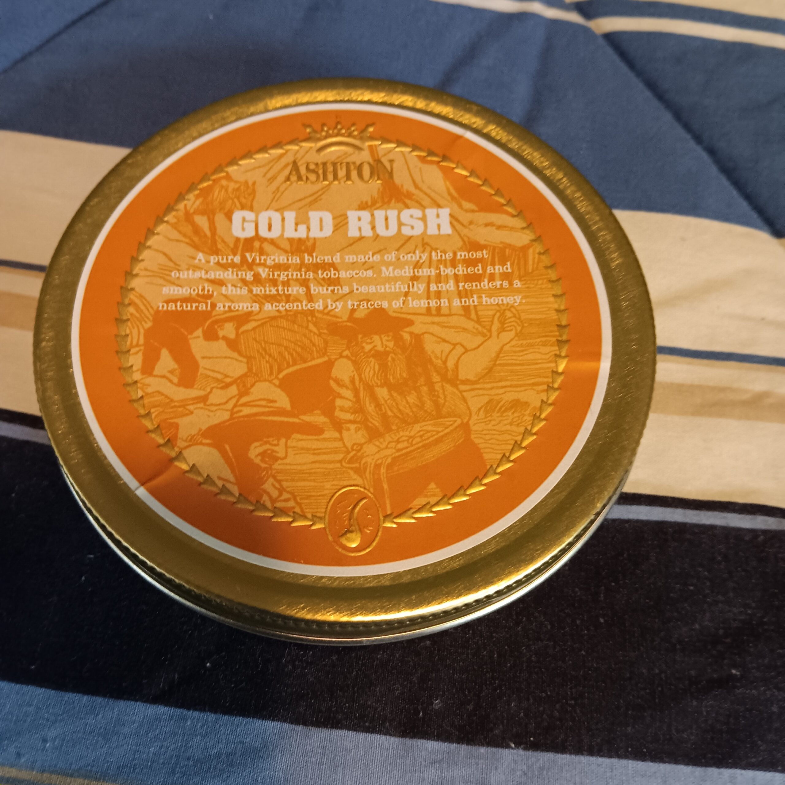 Ashton's Gold Rush is a pure Virginia blend made of only the most outstanding Virginia tobaccos. Medium-bodied and smooth, this mixture burns beautifully and renders a natural aroma accented by traces of lemon and honey.