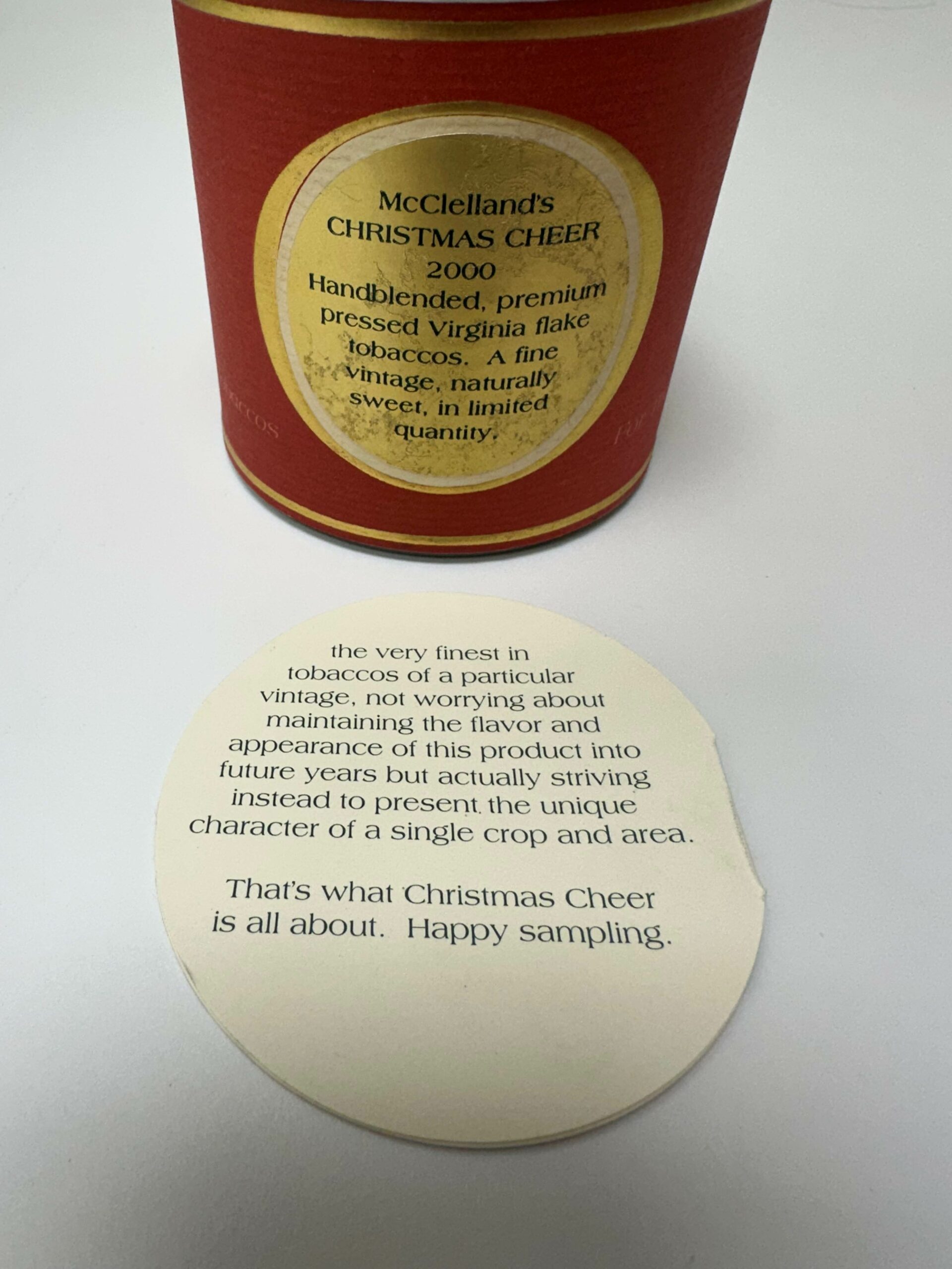 100gram tin of McClelland's Christmas Cheer 2000 was an epic year and this also has 25 years of age well stored and ready to smoke or add to your cellar