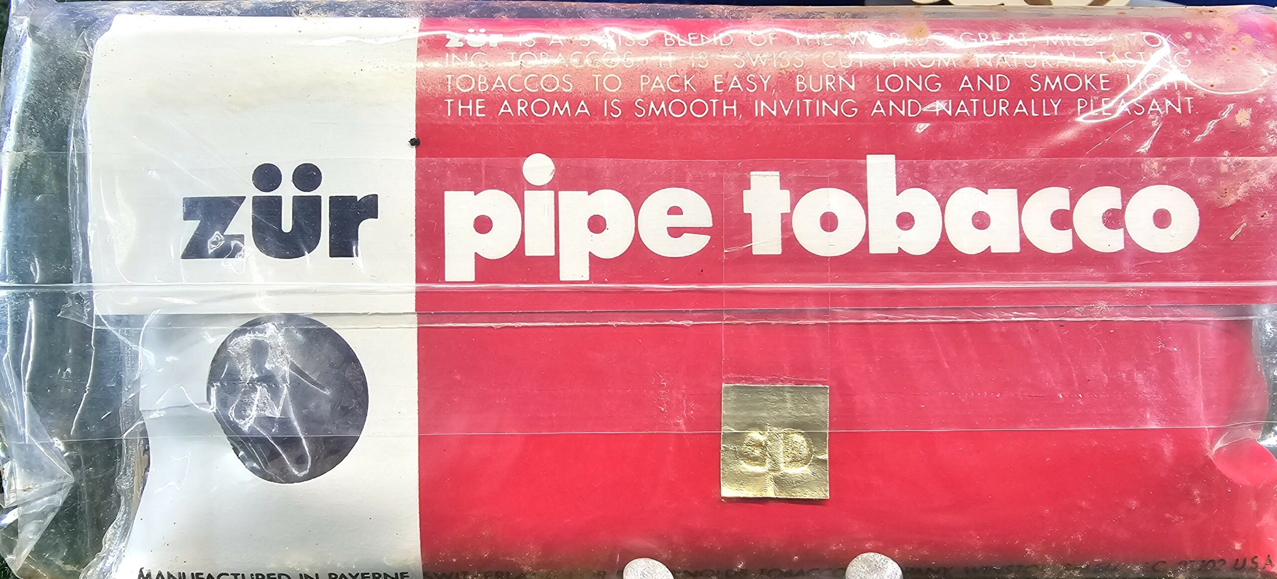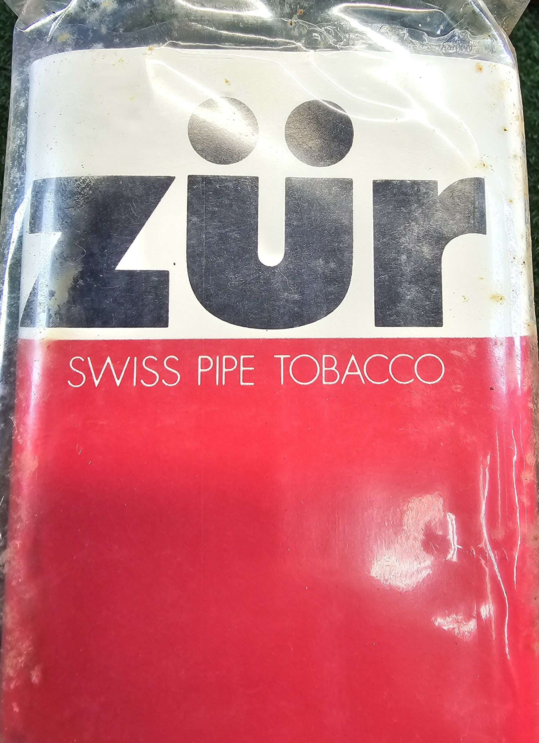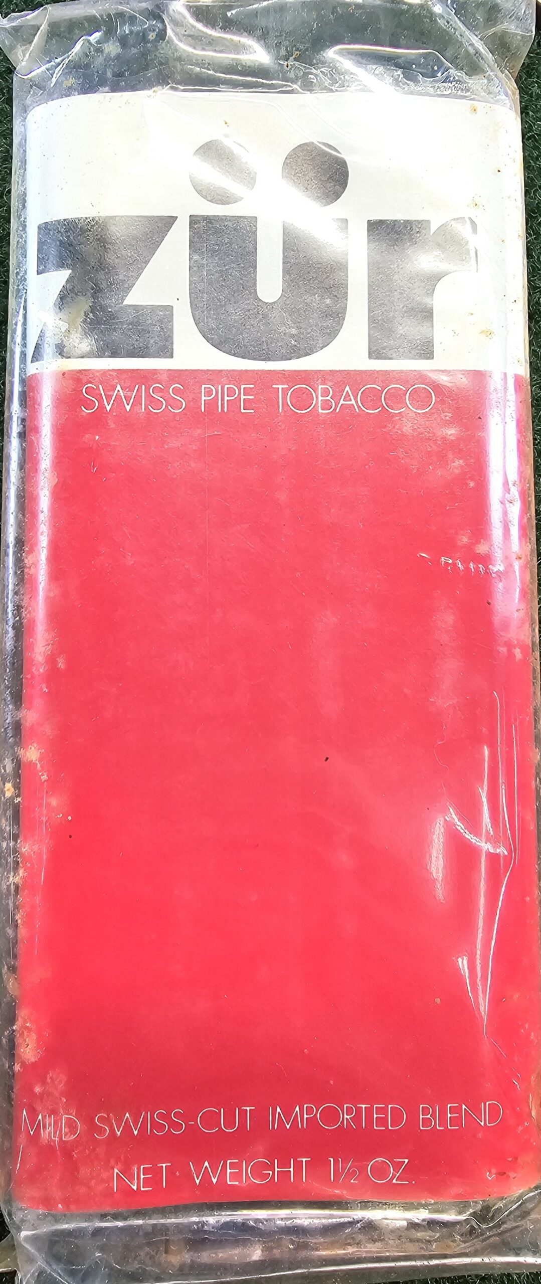 Zür was advertised as "Swiss-cut" tobacco in the 1970s. This is an unopened pouch in a sealed original bag.