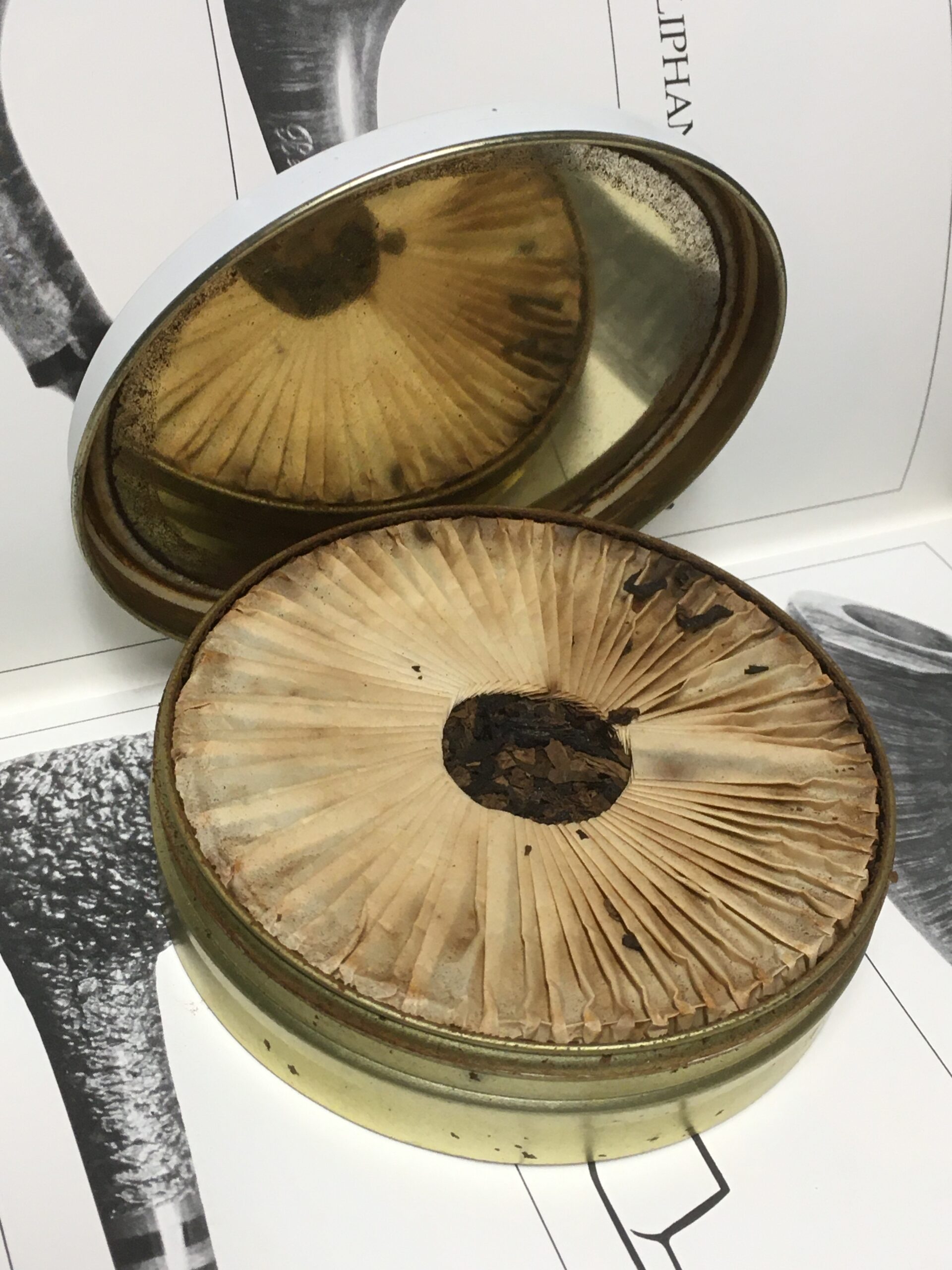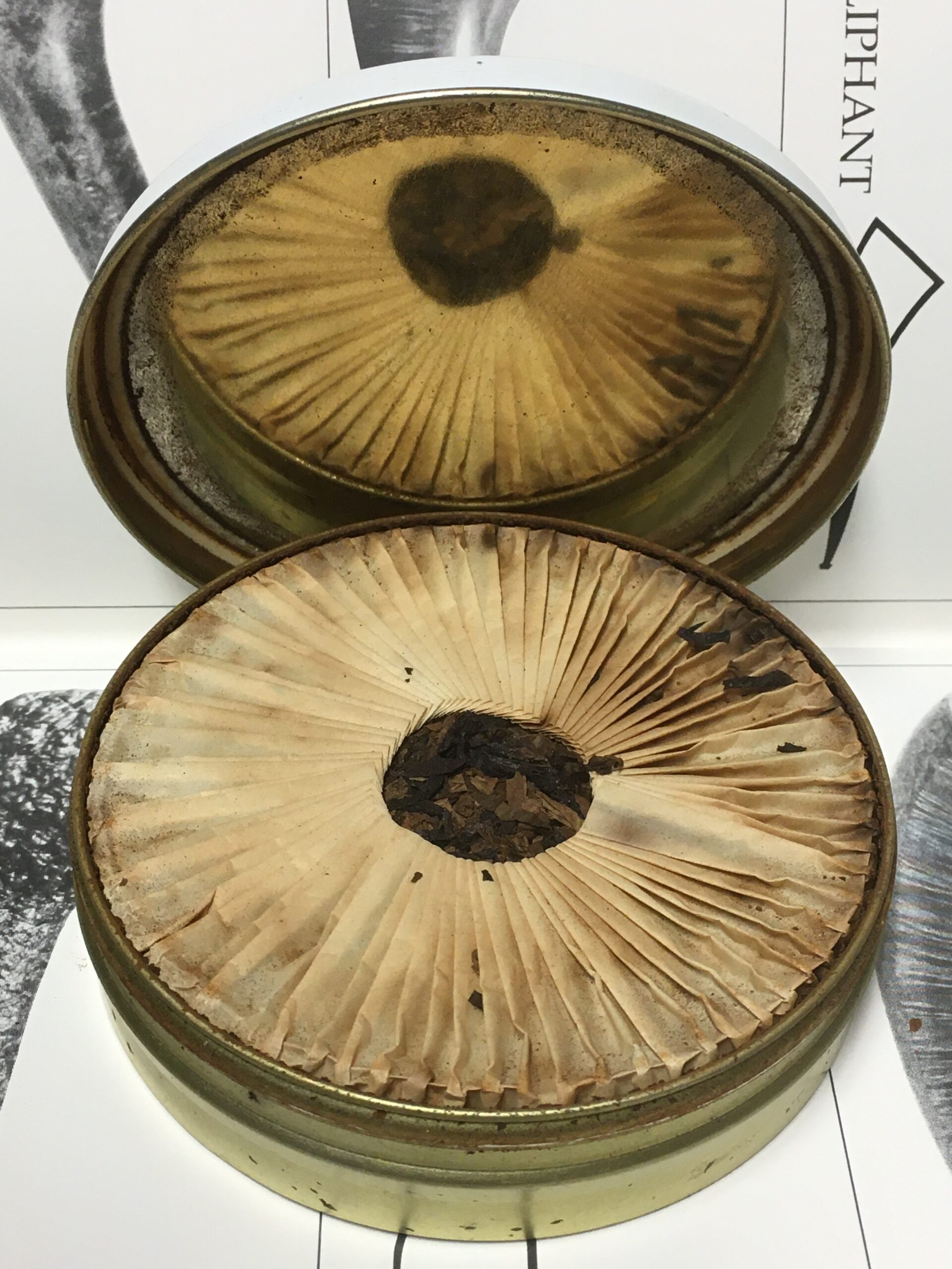 Tin was opened long ago, but the contents appear to be undisturbed. Tobacco is dry. Some oxidation to the tin, with a couple of tiny little dings in the bottom.