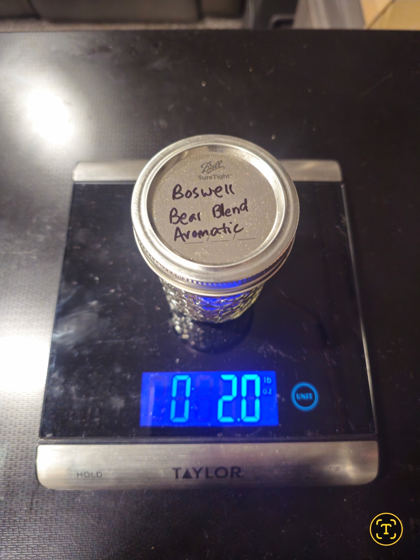 Weight of tobacco (in ounces) is shown on the scale in picture. The scale was set to zero with the weight of the jar and lid accounted for, so the shown weight is just the tobacco in the jar.