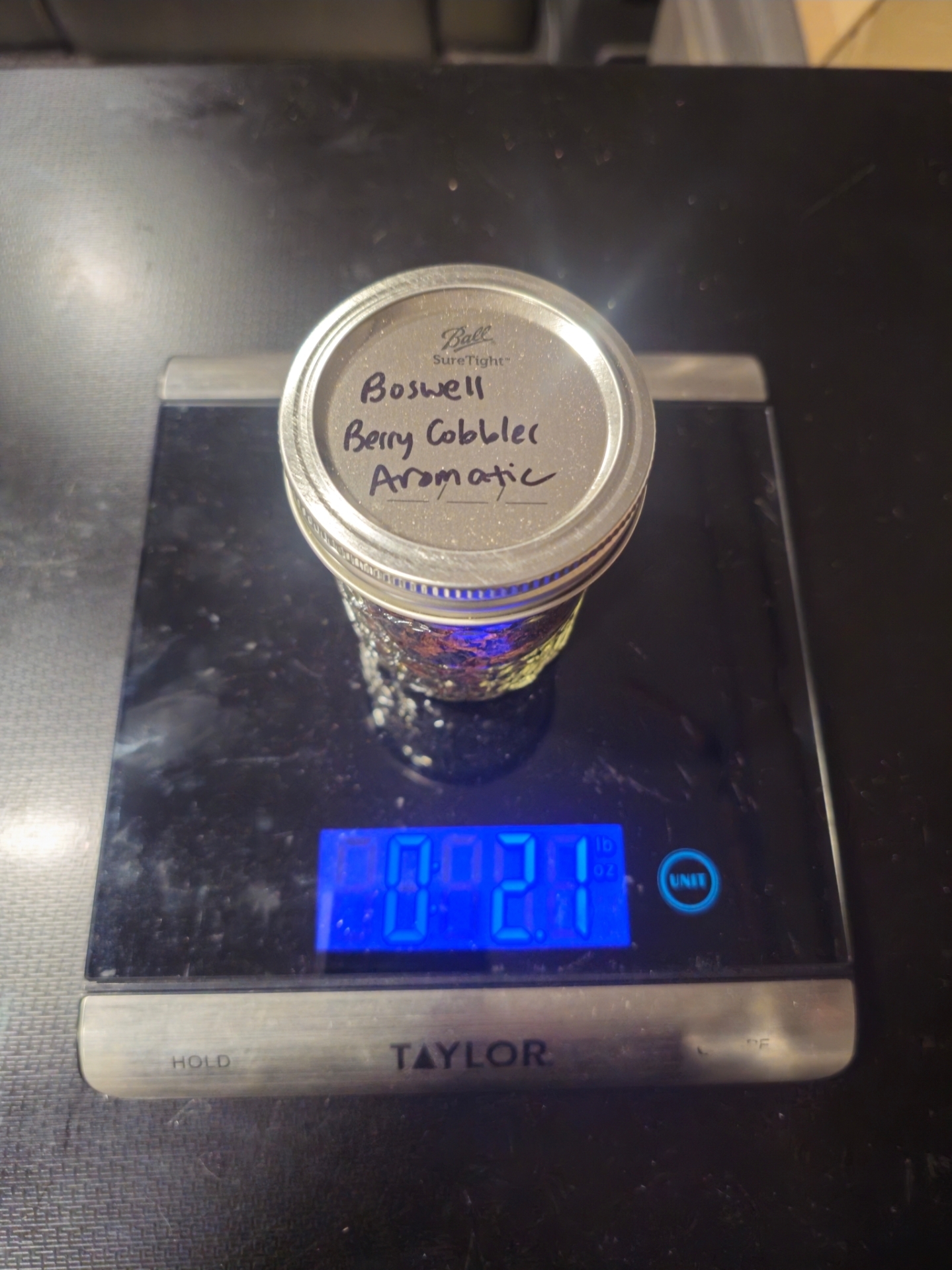 Weight of tobacco (in ounces) is shown on the scale in picture. The scale was set to zero with the weight of the jar and lid accounted for, so the shown weight is just the tobacco in the jar.