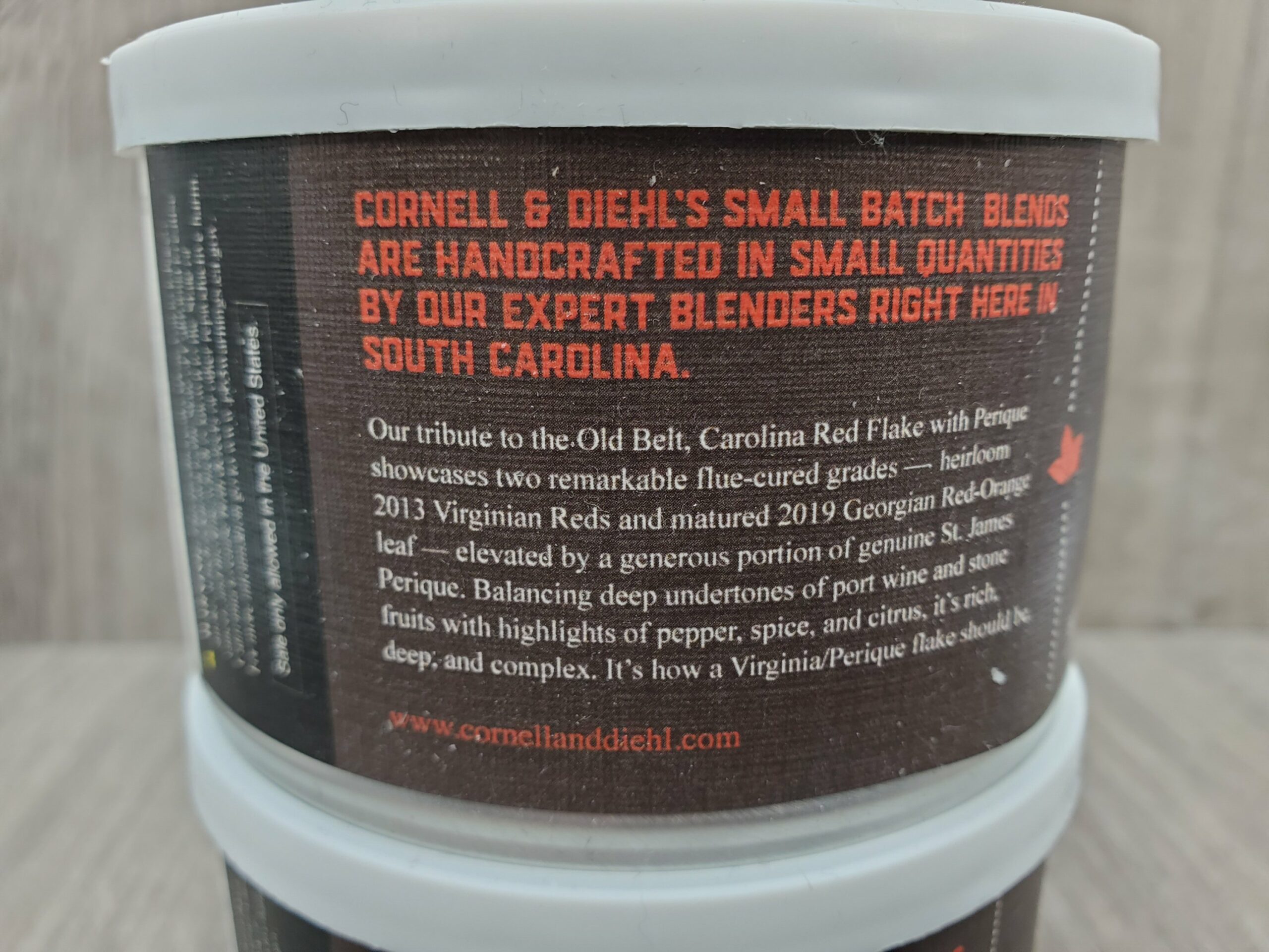 "Two remarkable flue-cured grades -- 2013 Virginian Reds and matured 2019 Georgian Red-Orange leaf -- elevated by a generous portion of genuine St. James Perique. Balancing deep undertones of port wine and stone fruits with highlights of pepper, spice, and citrus, it's rich, deep, and complex. It's how a Virginia/Perique flake should be."