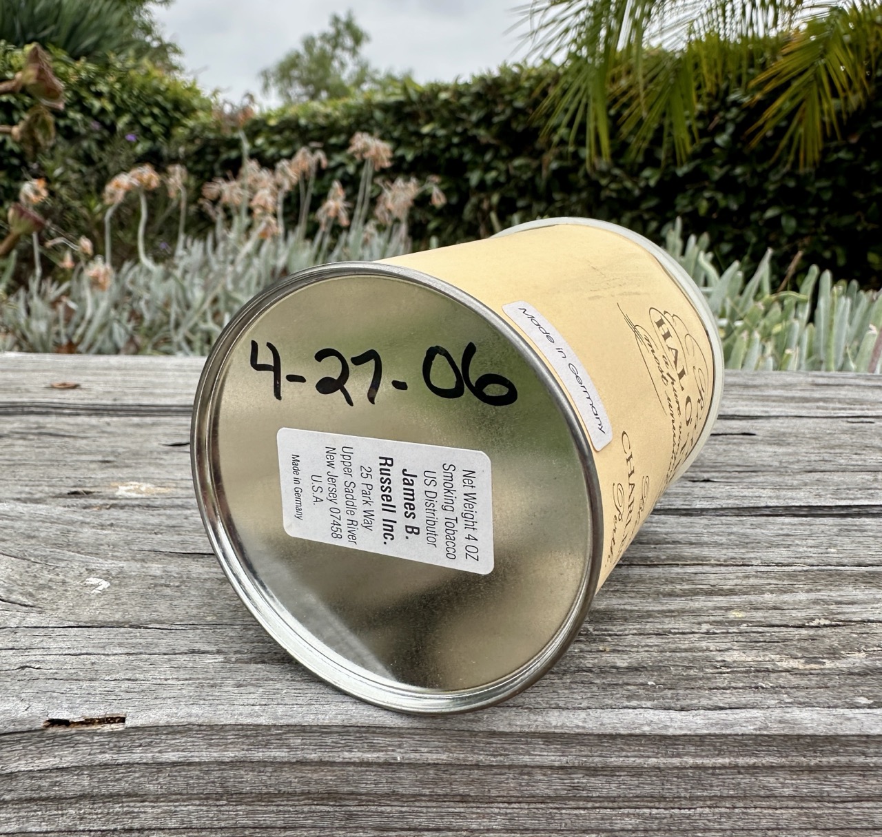 Immaculate 4oz tin from early German production by Kopp. The tin is hand dated to 2006 (when acquired) but the importer was James B. Russell at the 25 Park Way address. Date ranges from mid 1990s to very early 2000s. This is a fantastic Virginia Perique blend, at a prime age for enjoying.