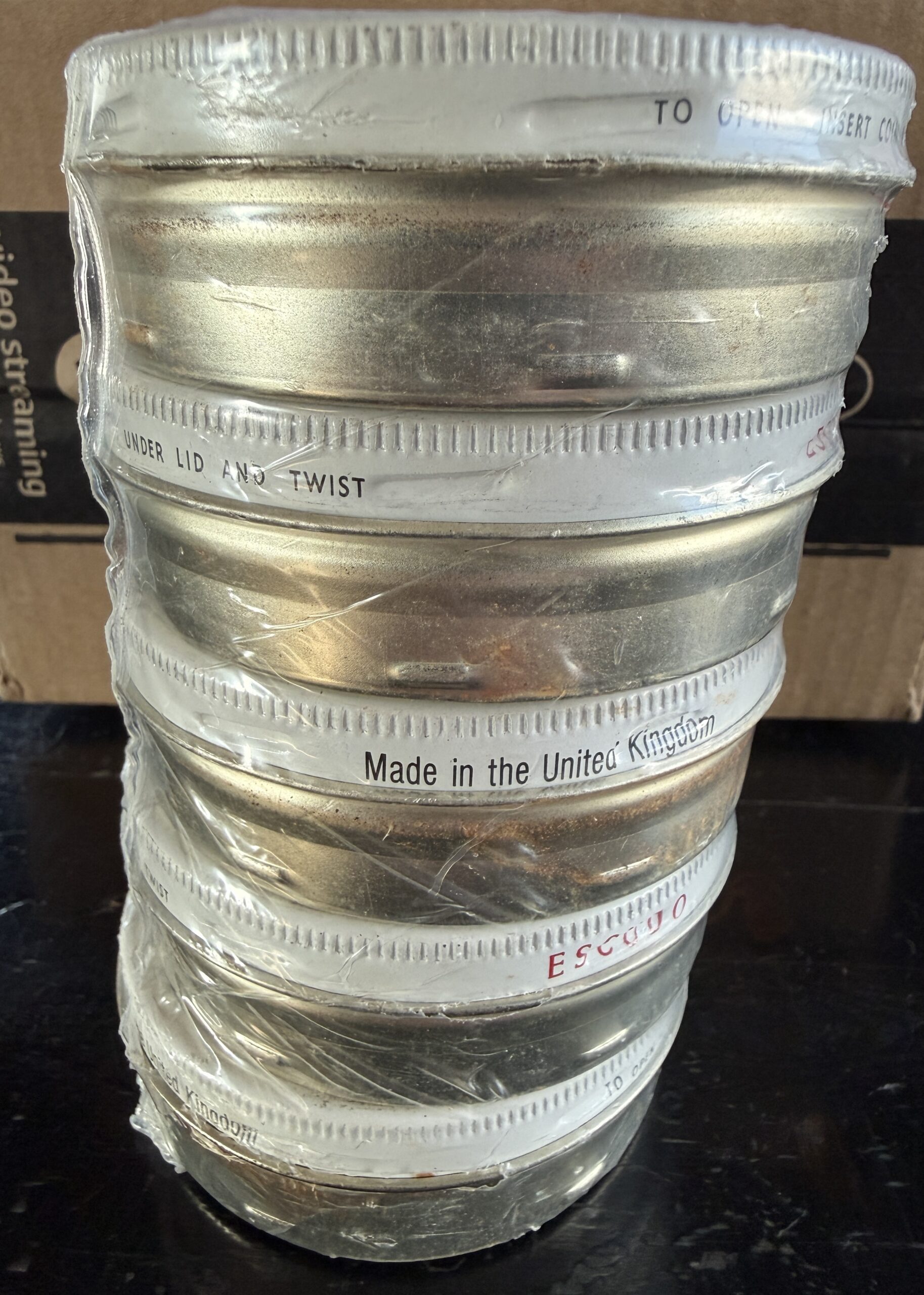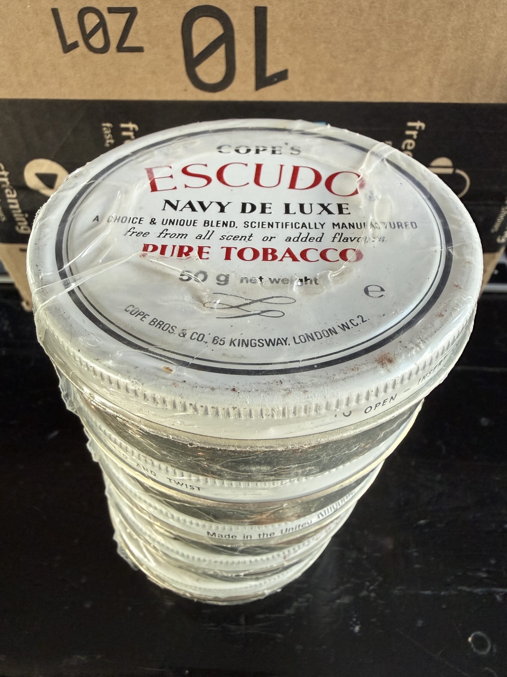 Up for auction is a 5-tin sleeve of Cope's Escudo. Made in the United Kingdom. Undisturbed shrink wrap. 16 oz total on my digital scale. Seals may be compromised. May require rehydration. Nice opportunity, here.