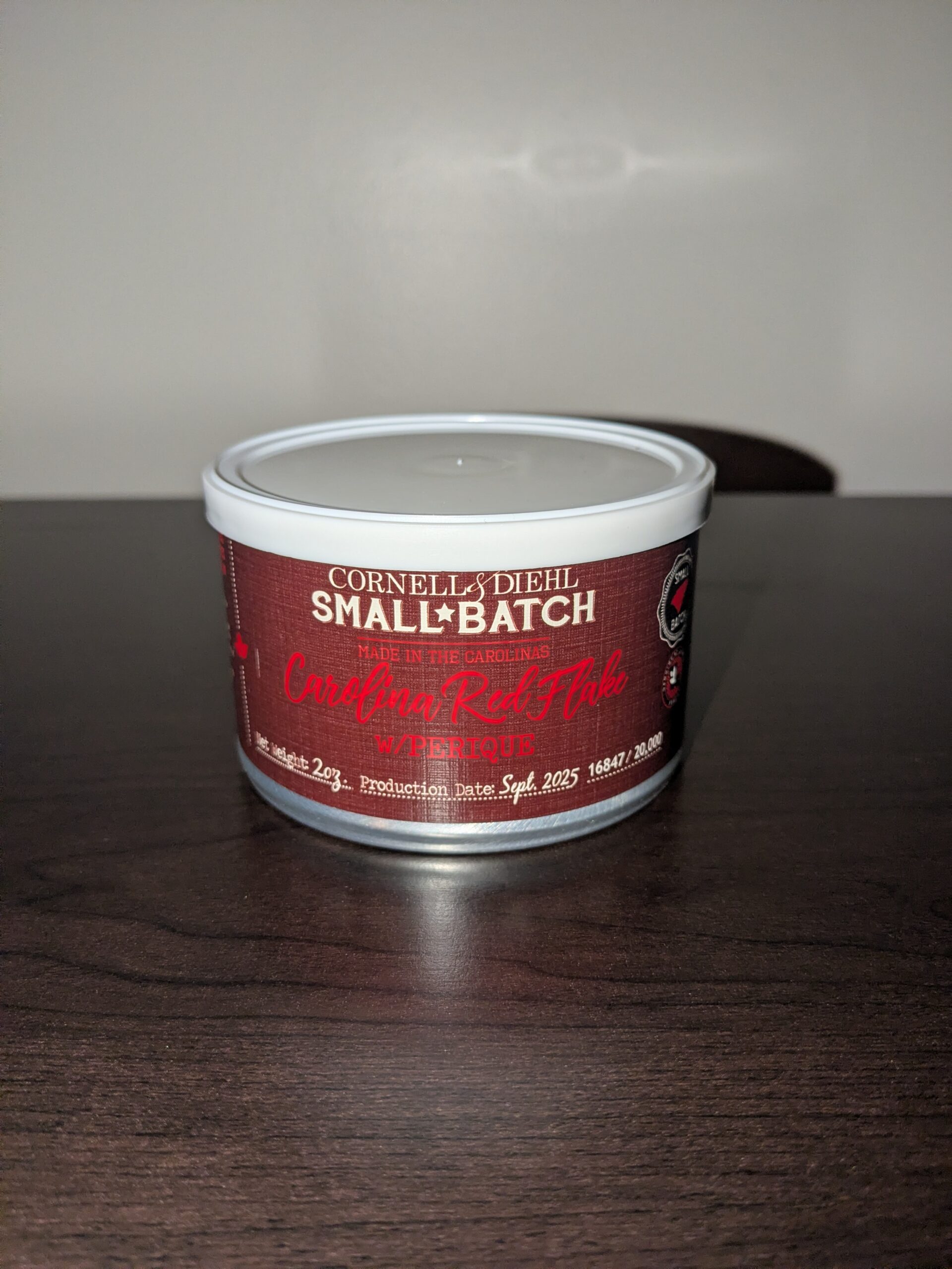 This auction is for one sealed tin of Carolina Red Flake with Perique from 2025 by Cornell and Diehl.