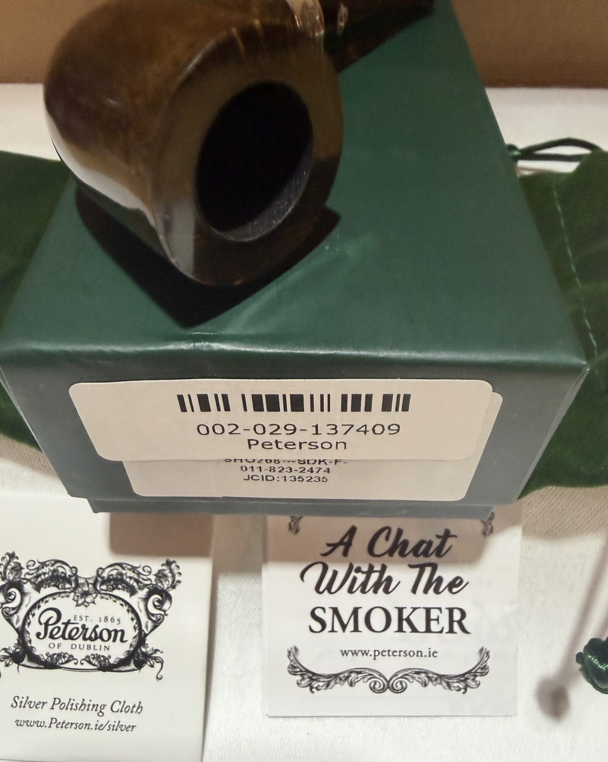 Up for auction is a brand new Peterson 268 Fishtail with Sterling Silver Band! Complete With box, pouch, brochure and polishing cloth!